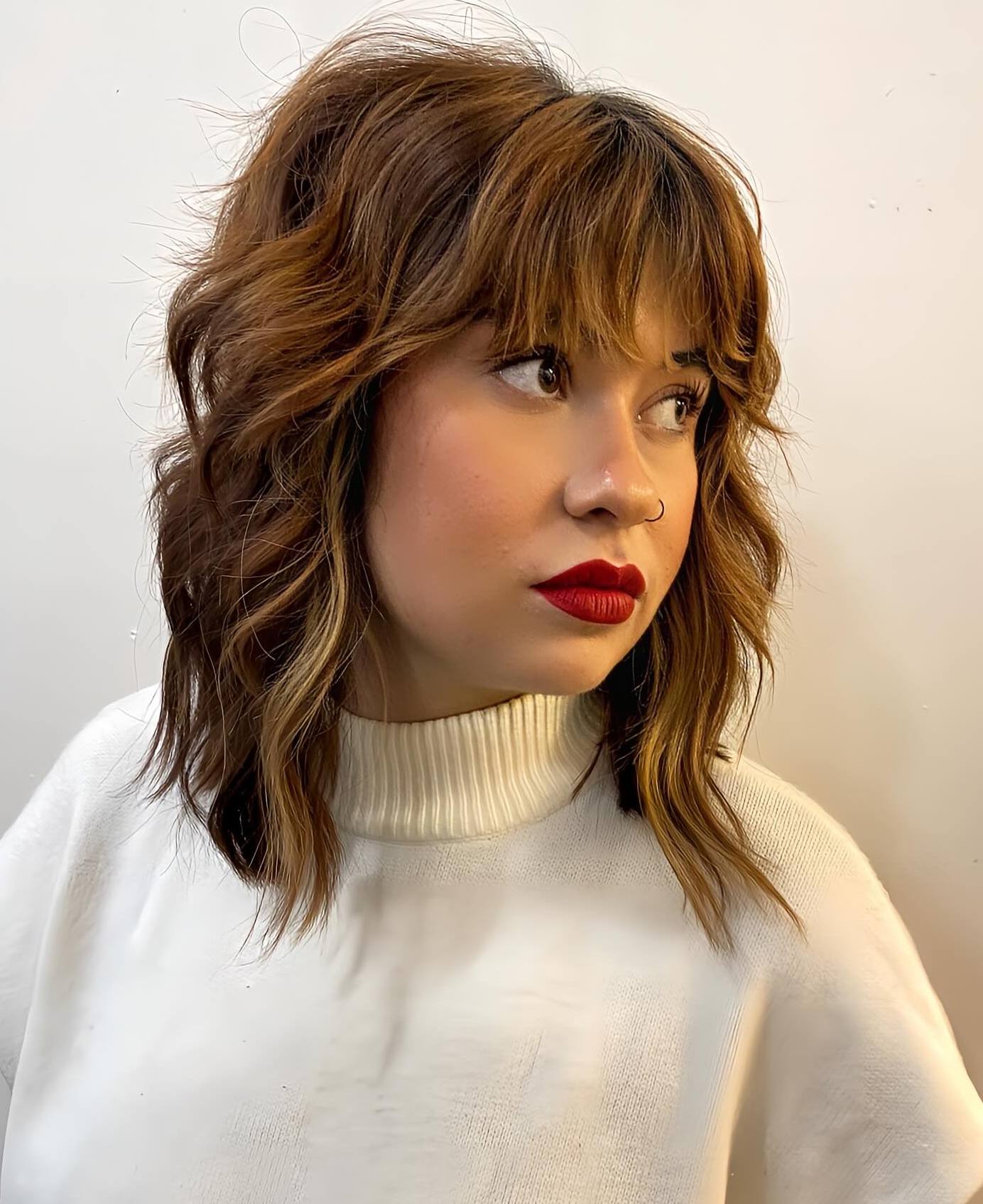 Face-framing waves and razored bangs are the hallmarks of this sassy haircut done in a brown-to-copper balayage. The tousled top and shaggy layers provide enough volume and crisp texture to make you feel gorgeous. Long pieces on the sides cover both ears completely, and the wavy tresses around the cheeks give the face a slimmer appearance.