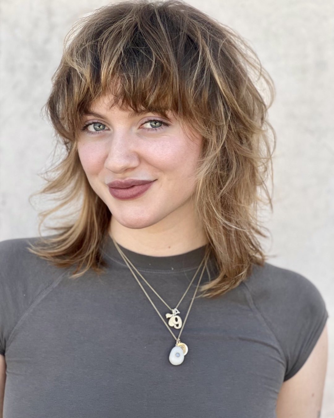 If you prefer a rocker or Harley hairstyle with bangs, look no further than a squared shag with lots of wispy face-framing locks to accent your delicate features. A multitude of sliced layers and tousled crown section give this light-brown shag a notably edgy quality.