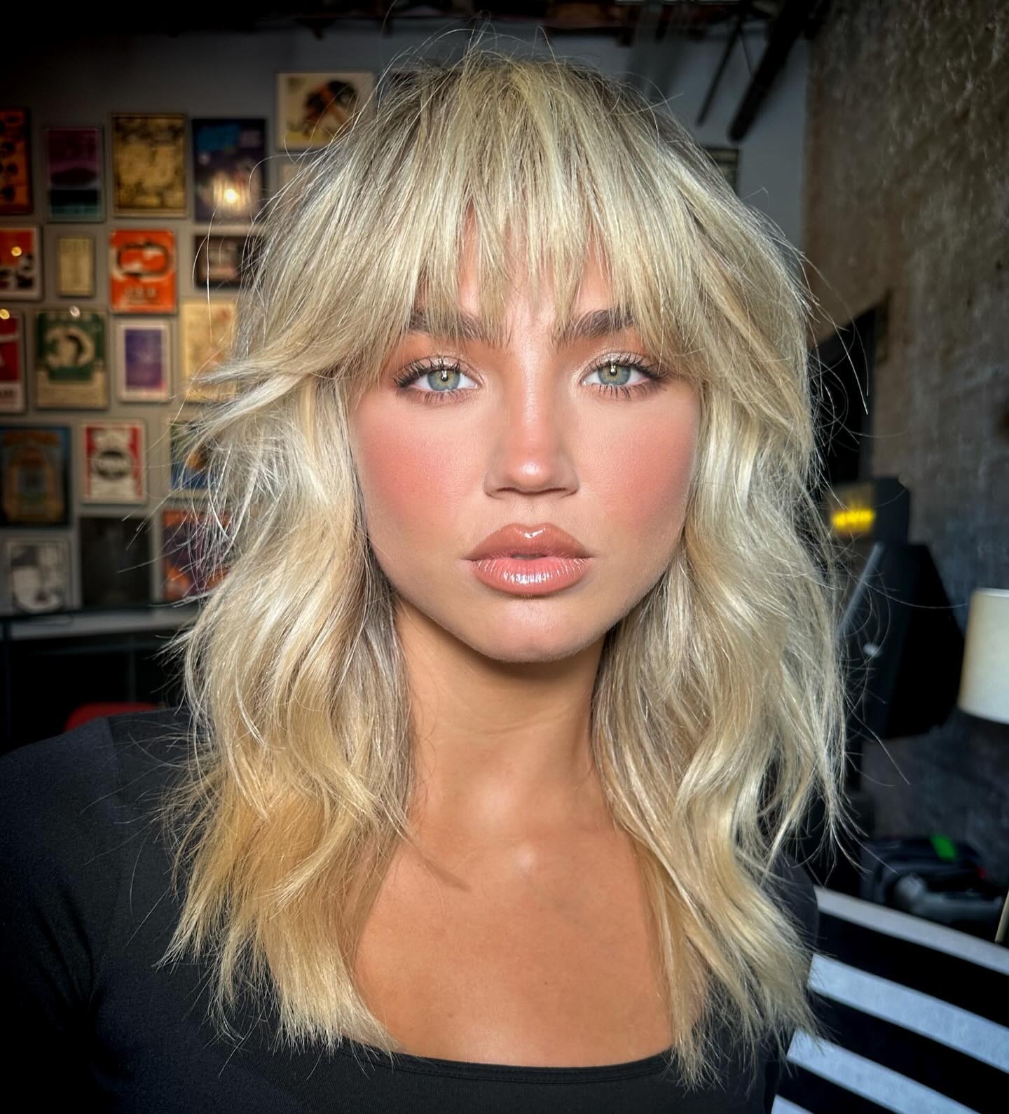 Razored layers with beachy waves are the perfect accessory for every season. This length of bangs gives a peek-a-boo vibe, and they’re still long enough if you want them out of your face.