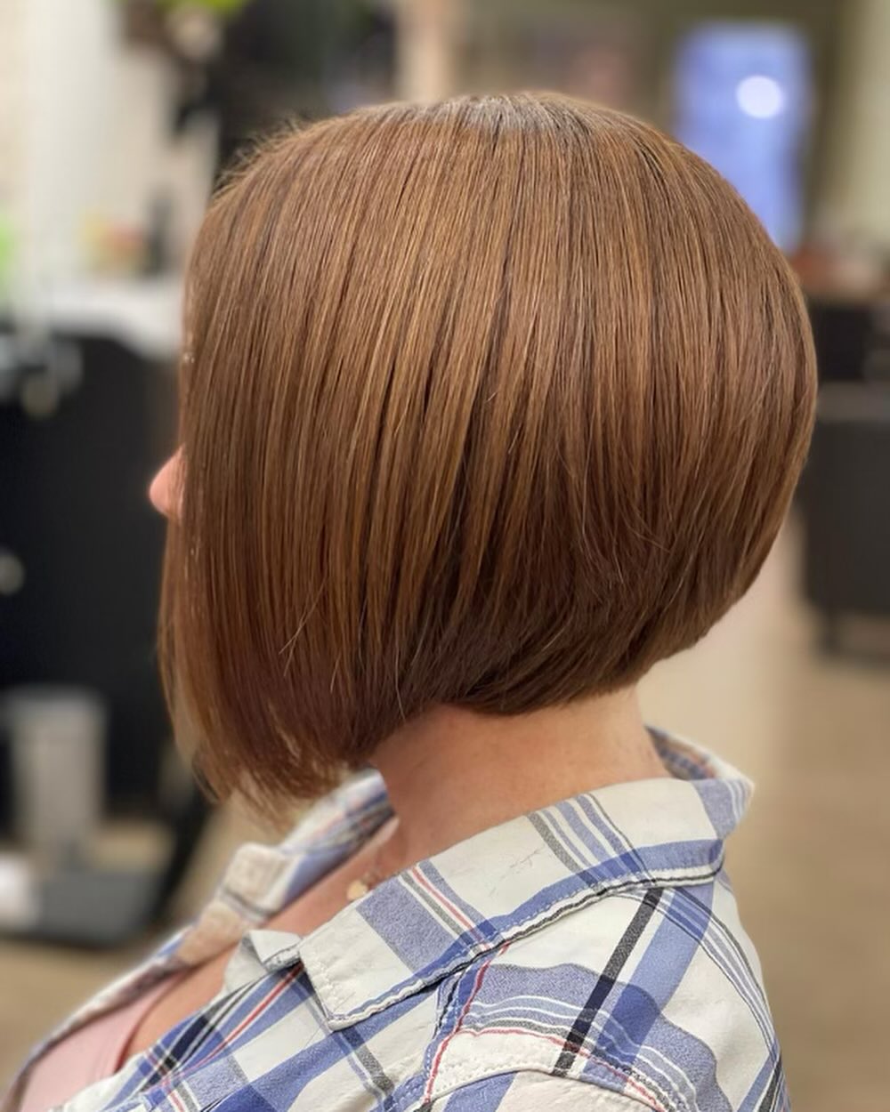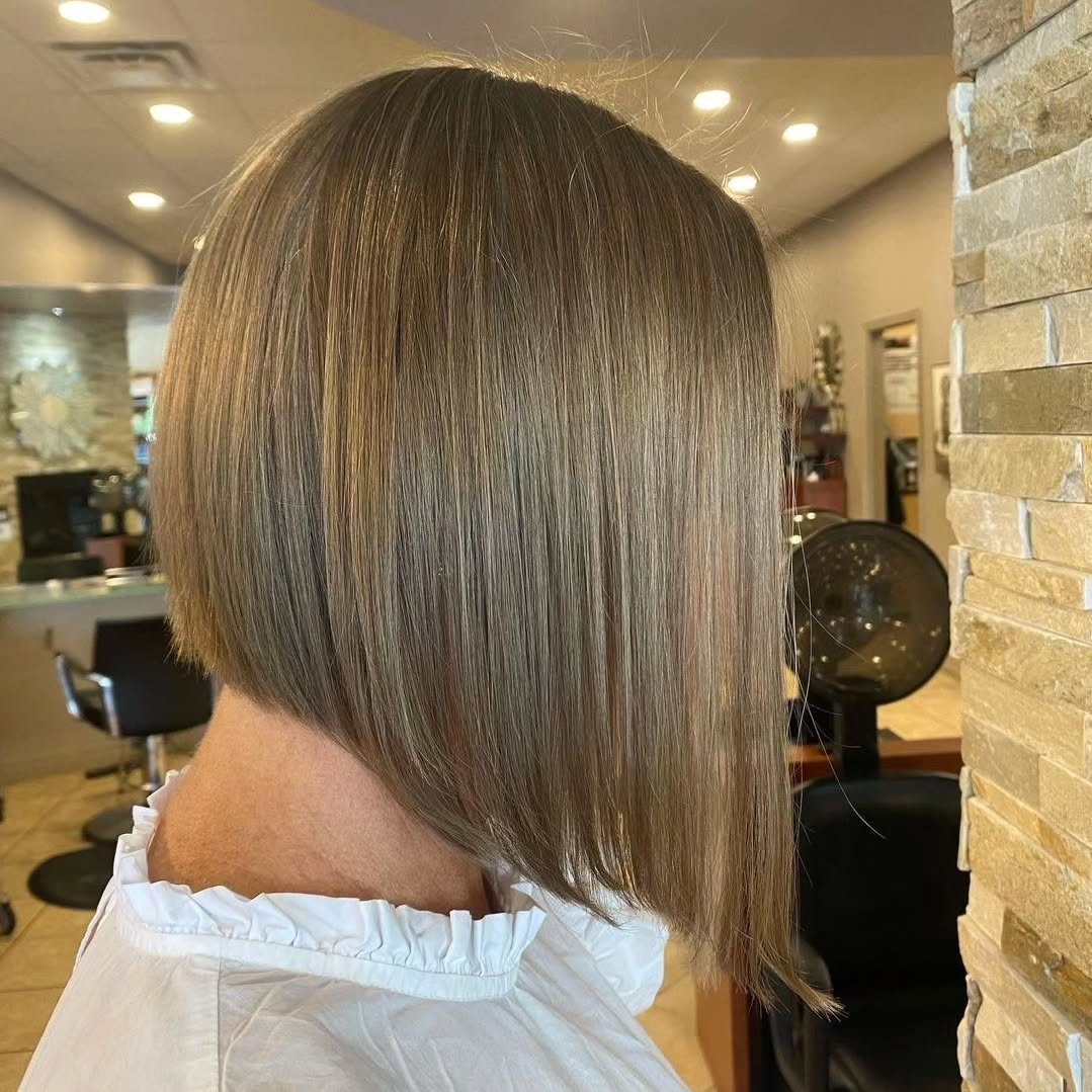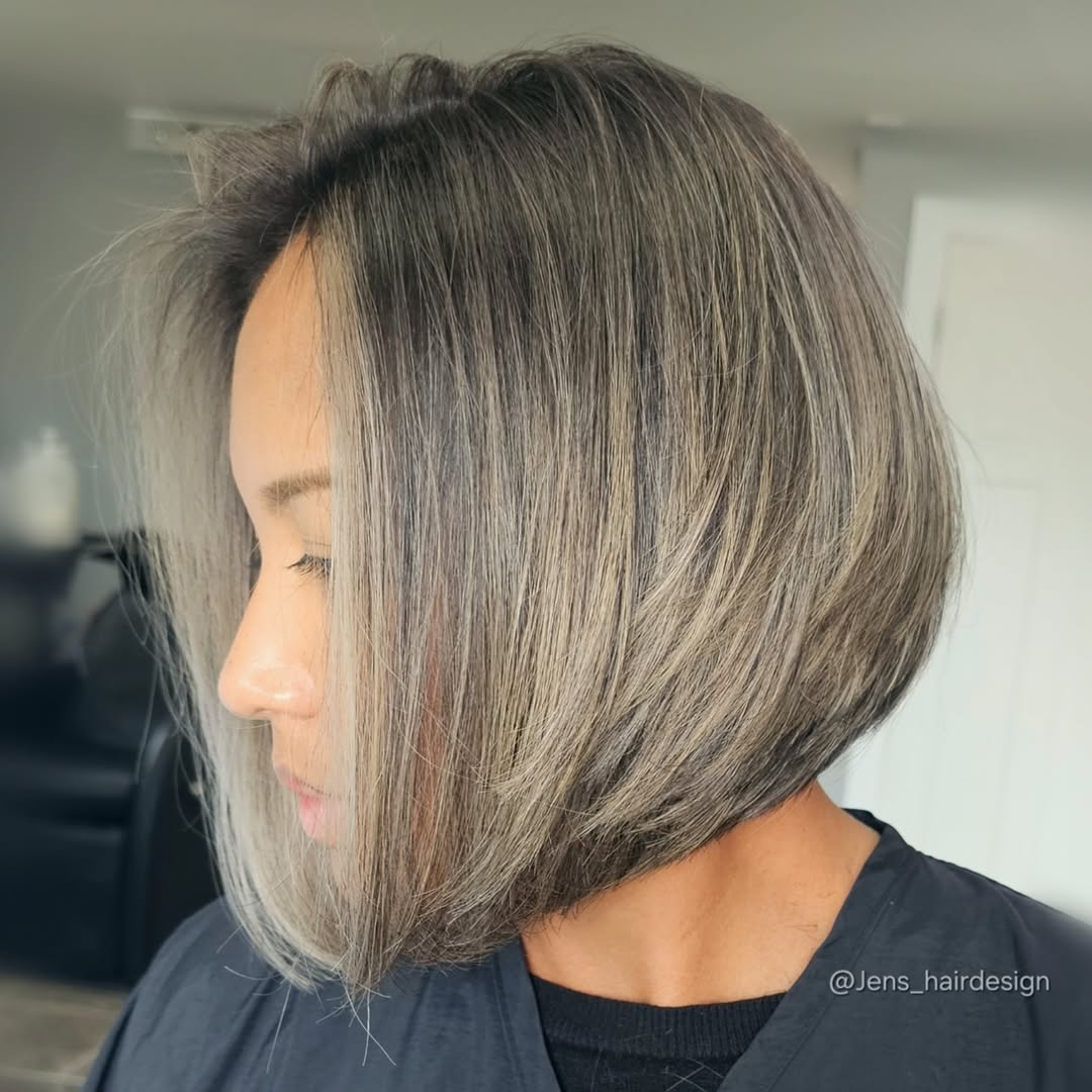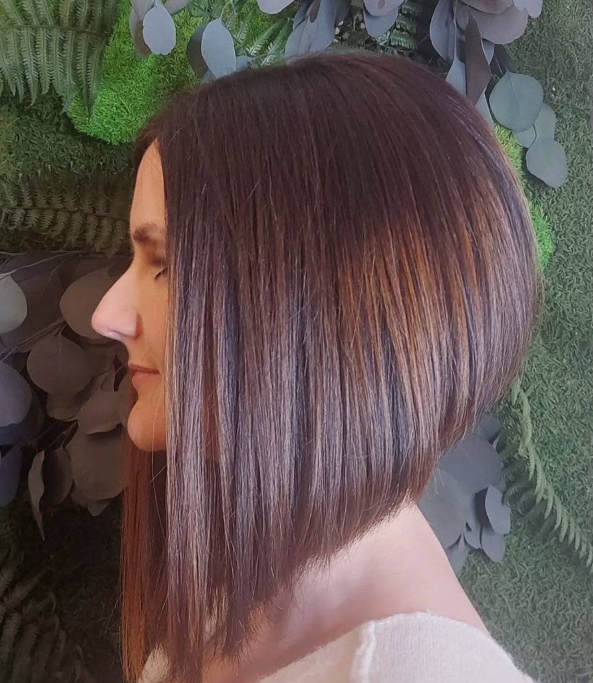 Angled bob hairstyles don’t always have to rely on sharp and dramatic cuts to be modern and trendy. Only a little longer in the front than the back, it’s a big enough difference to count. The slanting lines mixed with subtle layers give it volume, while highlights throughout enhance the appearance of depth.