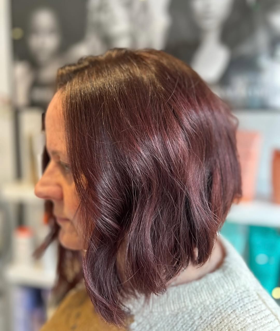 To lengthen a round face, you want to keep the front longer. Try light side swept bangs, which can be longer or shorter, and make sure to give the ends a bit of texture. Faint burgundy at the tips allows the style to glow from underneath.