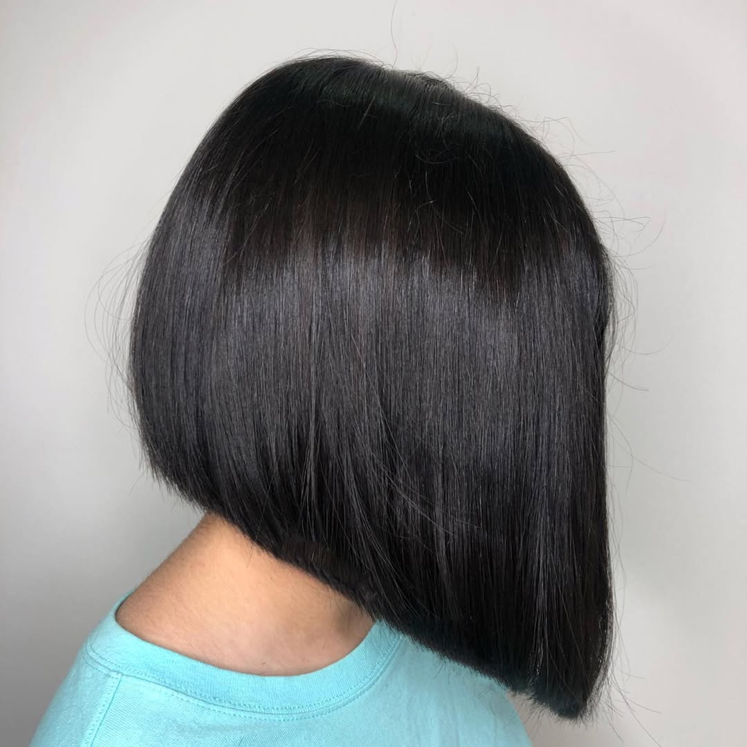 With the angled front falling well below the collarbone, this lob is as sexy as it is sleek. The deep black hue enhances the mystique. You can opt for some highlights or color if you want to brighten up the hairdo, but the noir shade is essential if you want something that radiates polish and confidence.