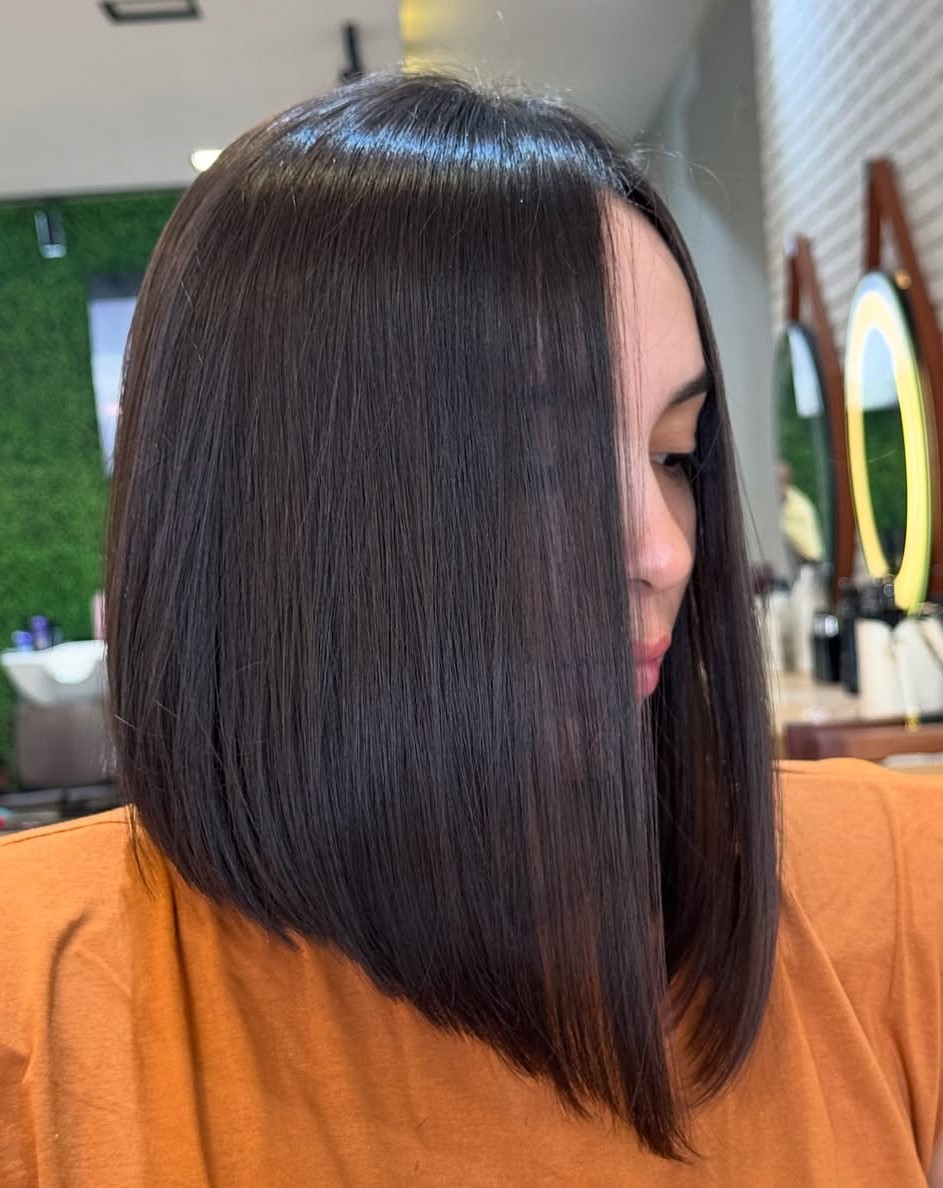 Looking for a longer haircut? Consider getting this one, perfectly straight and smooth. This simple and classic bob has just a teeny bit more length on one side. You can choose which one, of course.