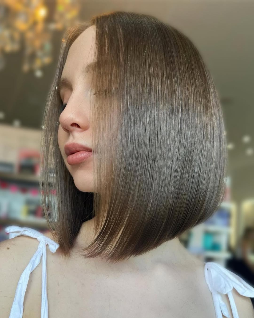 Taking a classic bob haircut a few inches down reveals this haircut’s impressive versatility. A-line bob looks absolutely awesome on straight hair, while ash-blonde balayage substantially spices up this stylish look.