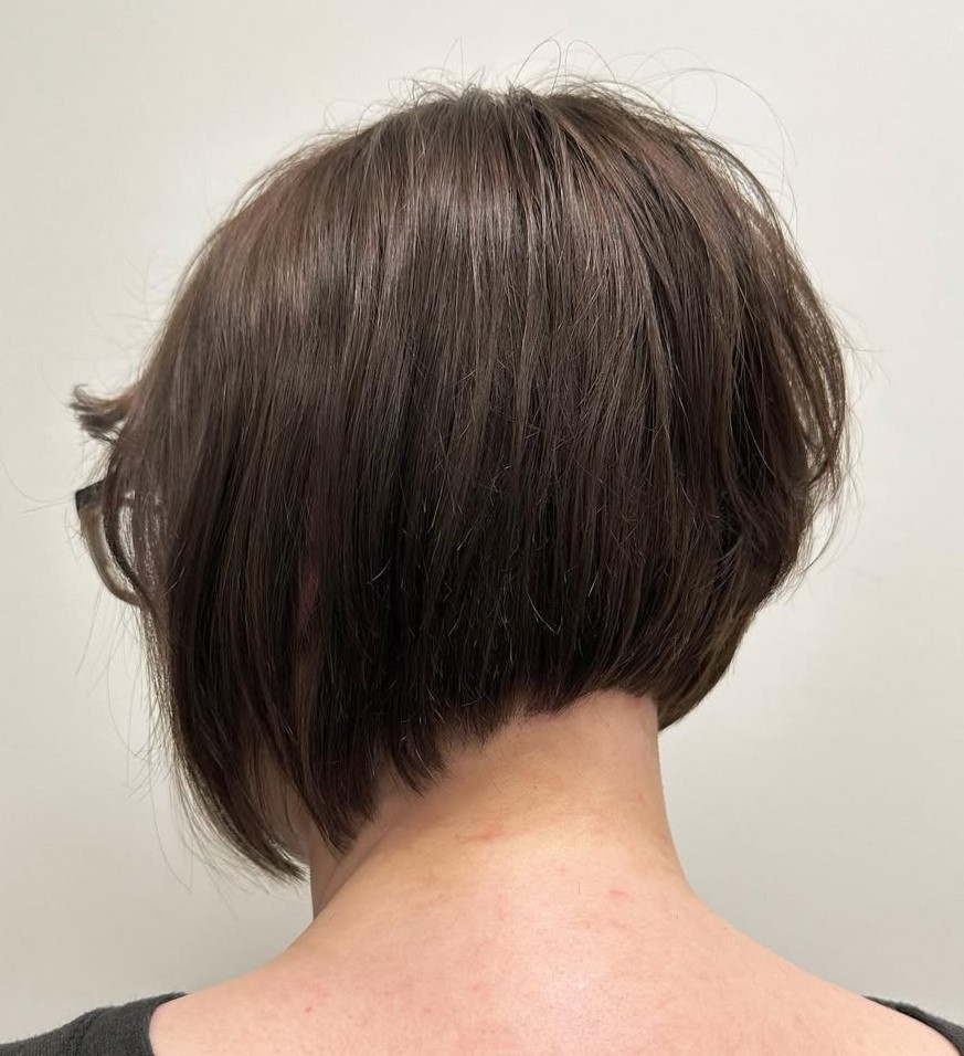 Slightly stacked in the back, this angled bob is great for those with very straight hair. The main shape of the style cradles the back of the head, seeming almost to be a Flapper Style, but the point below the ears says otherwise.