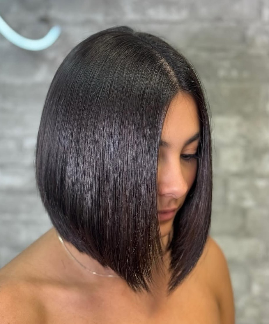 This angled blunt bob looks ultra-chic and trendy. To show off the blunt line, wear it straight. This version is awesomely hot since it draws attention to your collarbone.