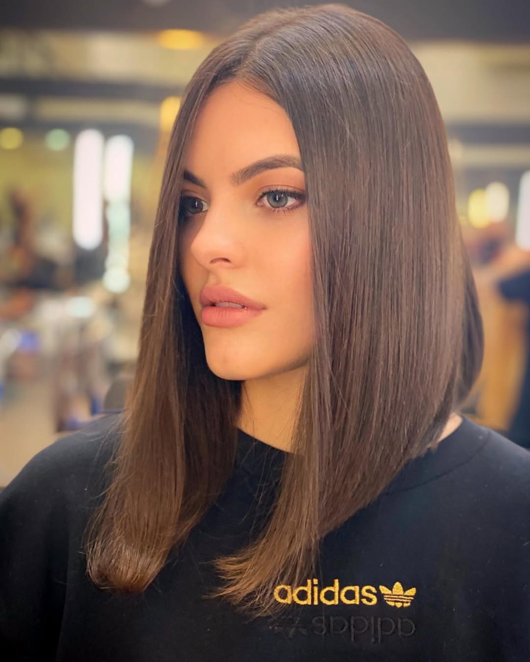 This extremely long angled bob looks just jaw-dropping. Rich dark color coupled with straight and flowy texture helps to achieve an awesome dramatic vibe.