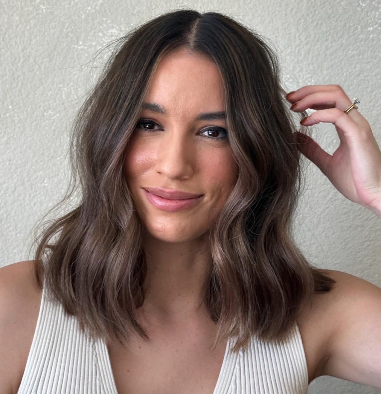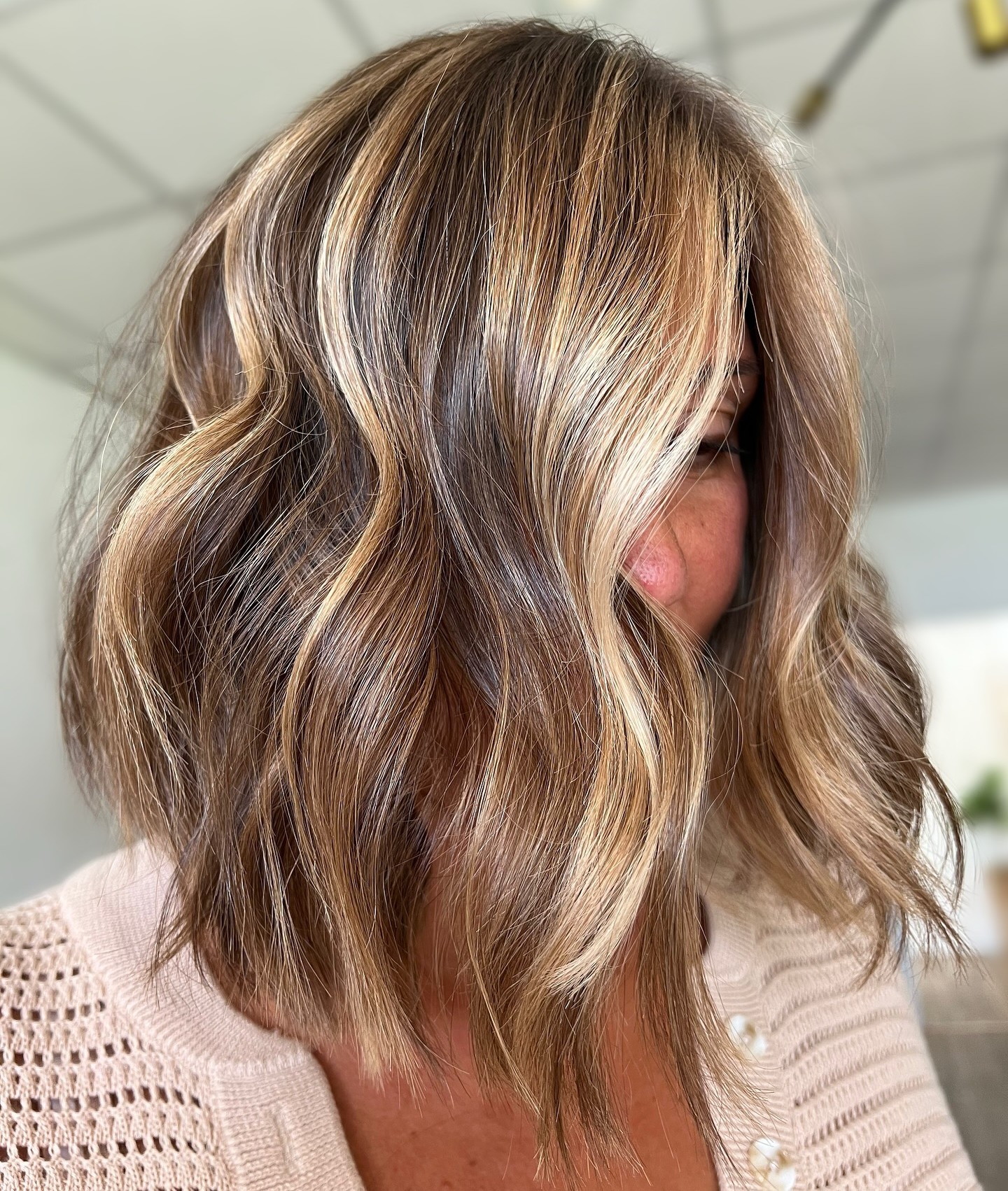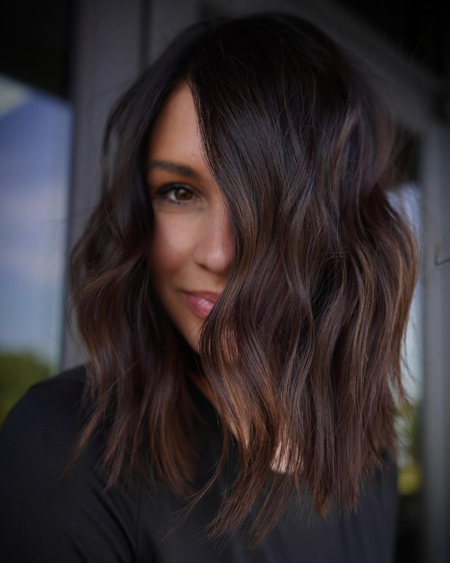 A lived-in blonde balayage is perfect for showing off the soft layers and shine of your textured lob. To style this feminine look, use a flat iron and shine serum, and blow-dry with a round brush for added volume.