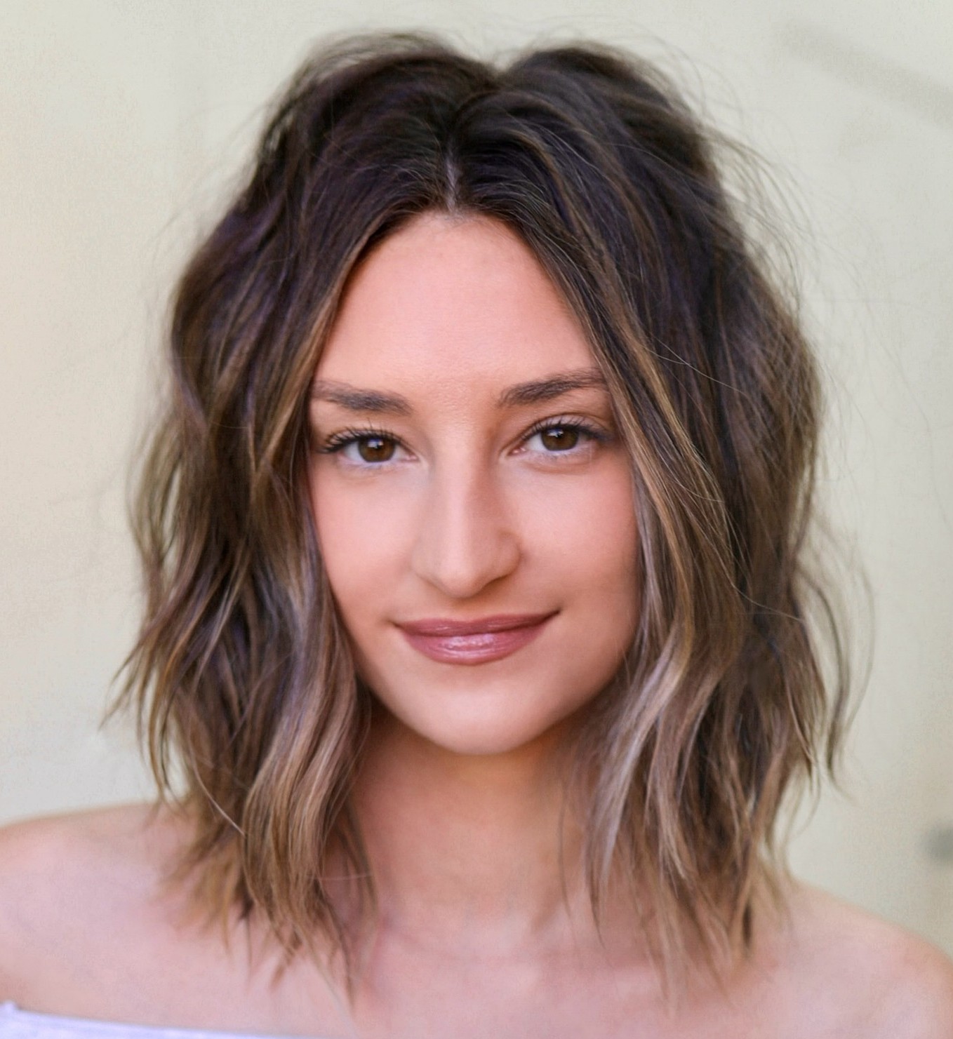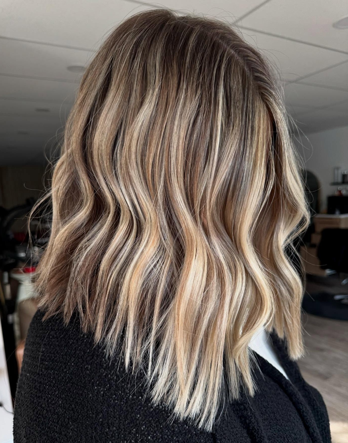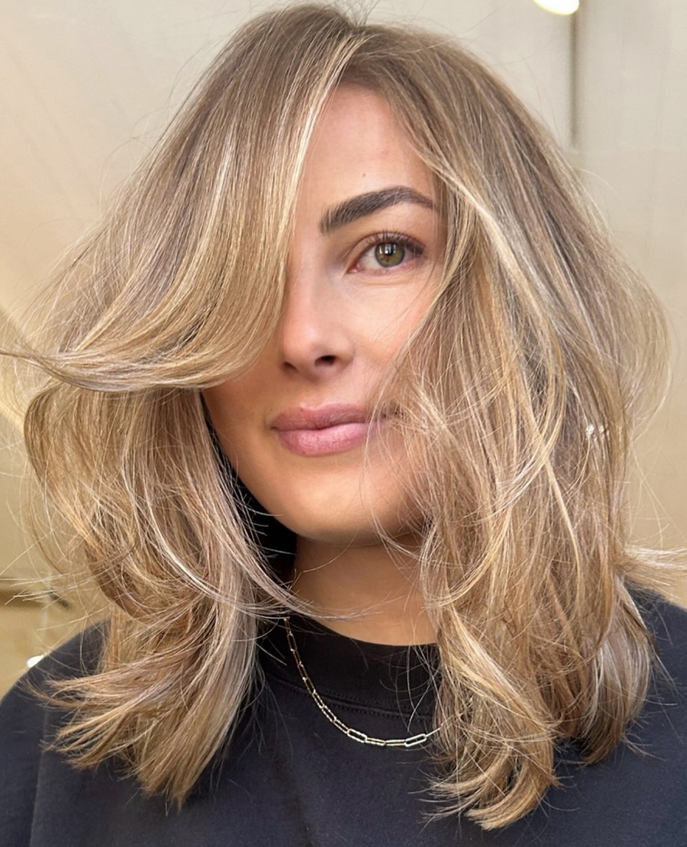 A lived-in blonde balayage is perfect for showing off the soft layers and shine of your textured lob. To style this feminine look, use a flat iron and shine serum, and blow-dry with a round brush for added volume.