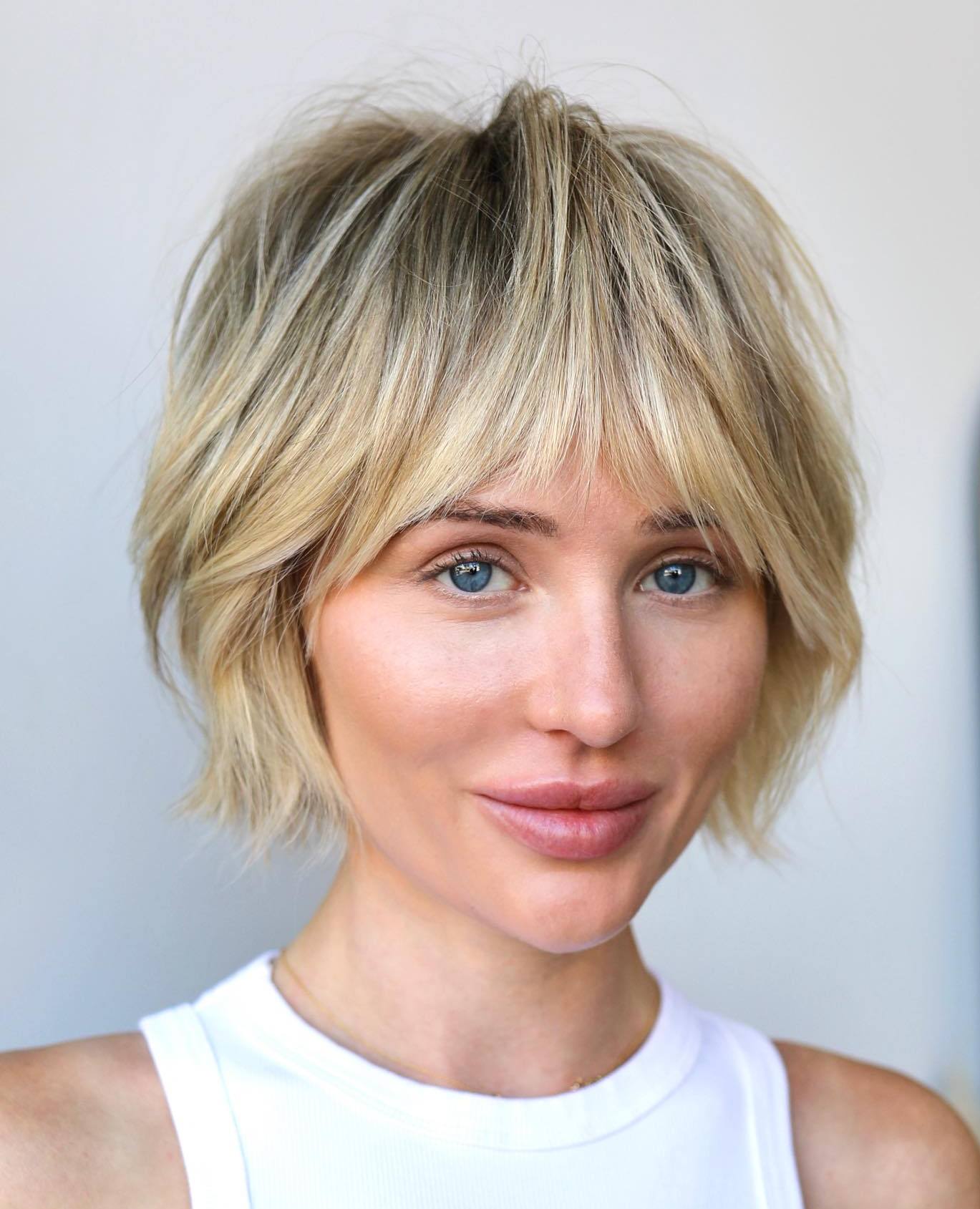 Add bangs to a layered crop, and you instantly have even more character. They bring out your facial features, soften your look, or add a playful touch, depending on your chosen style.