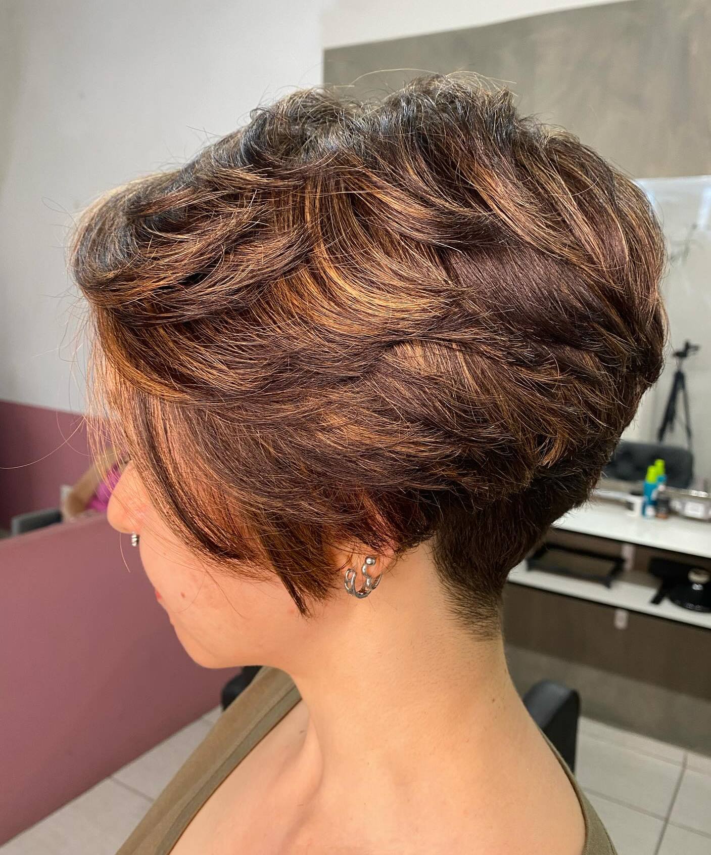 Add a little tousle to the crown of your hairstyle to give it some extra height. The tawny-brown color with light blonde highlights provides a lot of eye appeal. A shaggy pixie bob looks best when styled messy but can also be styled more sleek for a traditional vibe.