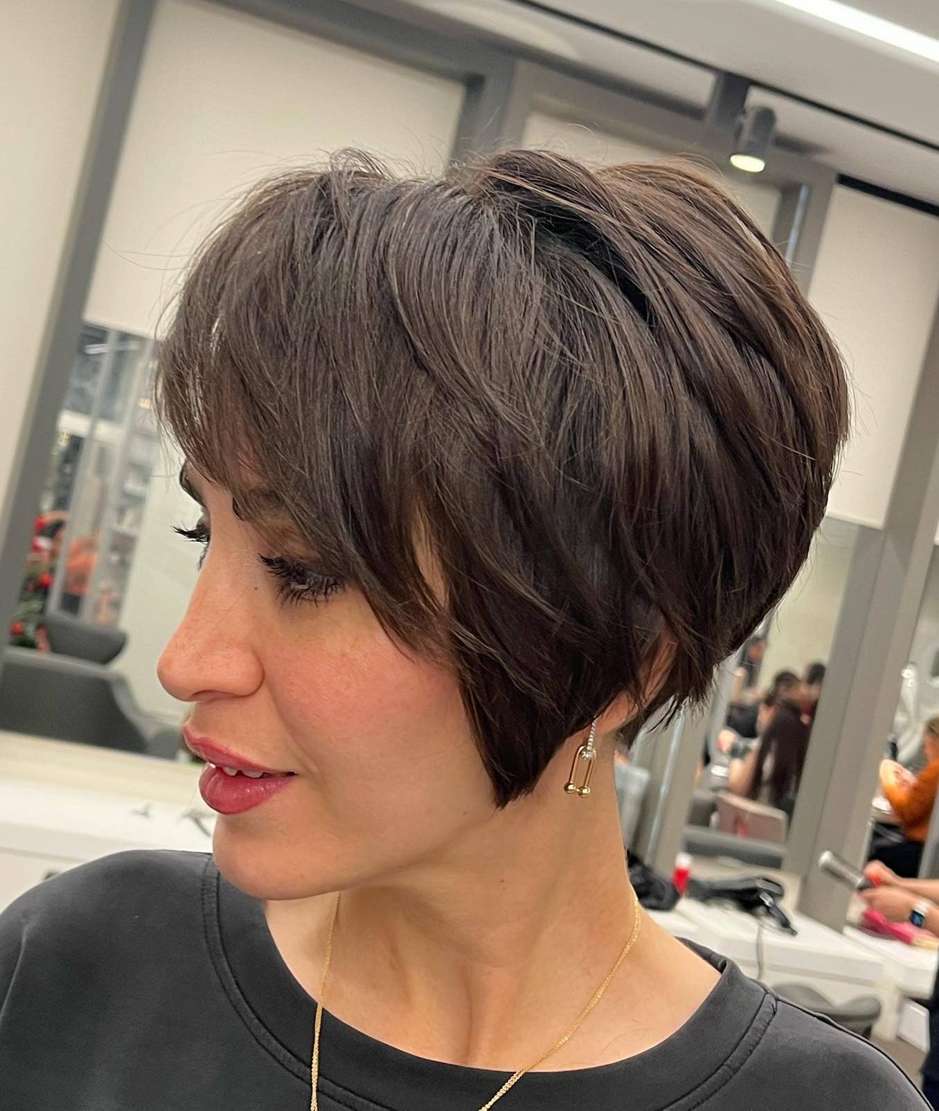 A layered cut is a stylish way to emphasize the volume of thick hair. With a deep side part and choppy pieces throughout, the full-bodied, long pixie bob commands attention. A dark brunette flatters the style, but feel free to add color if you want to boost its wow factor.