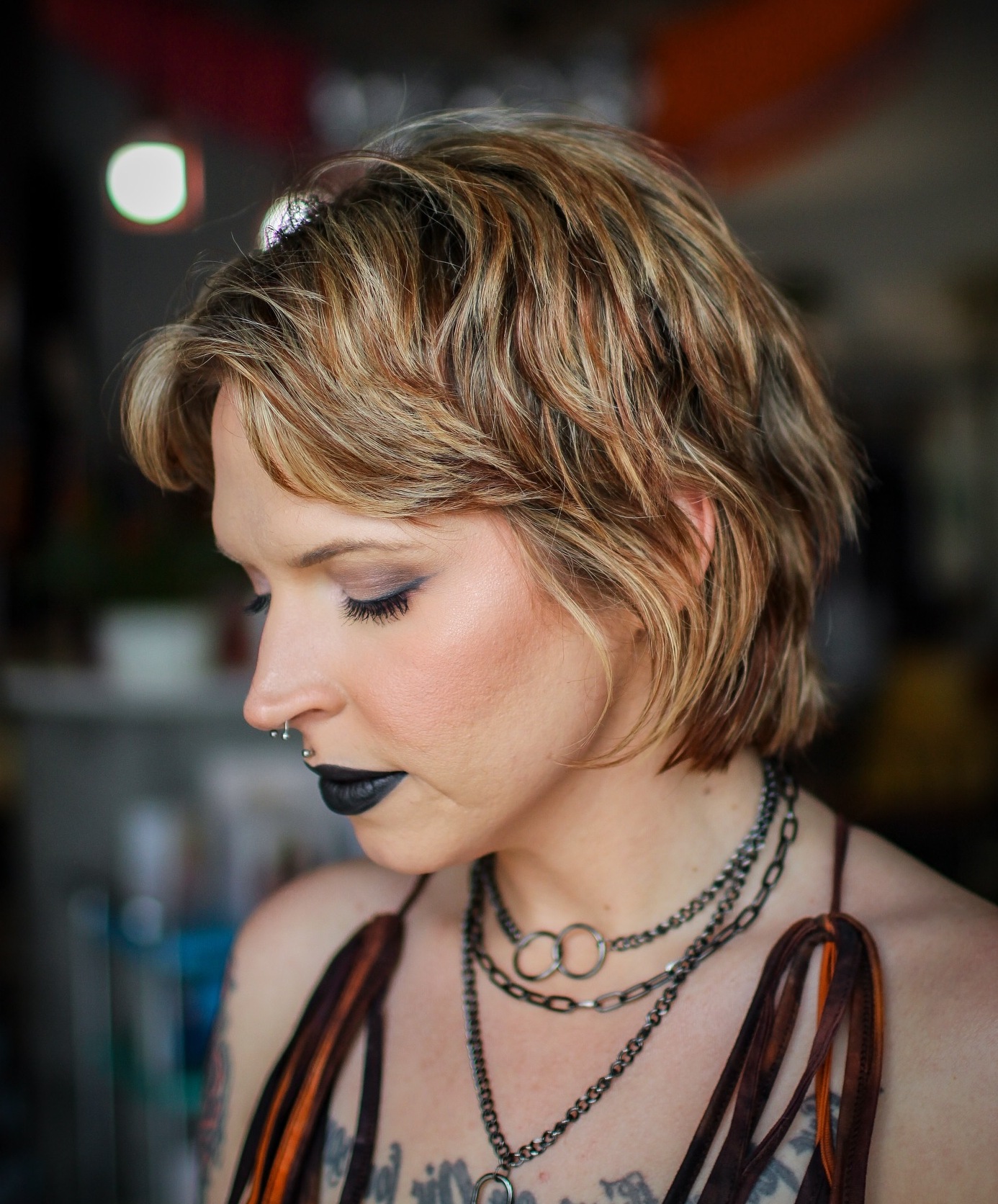 An A-line bob is a classic and super customizable cut. Adding messy interior layers creates a sleek look when straight and a tousled look when curled. Alternating different colors between your short layers using the balayage technique plays up the texture and adds depth, creating a fuller look.