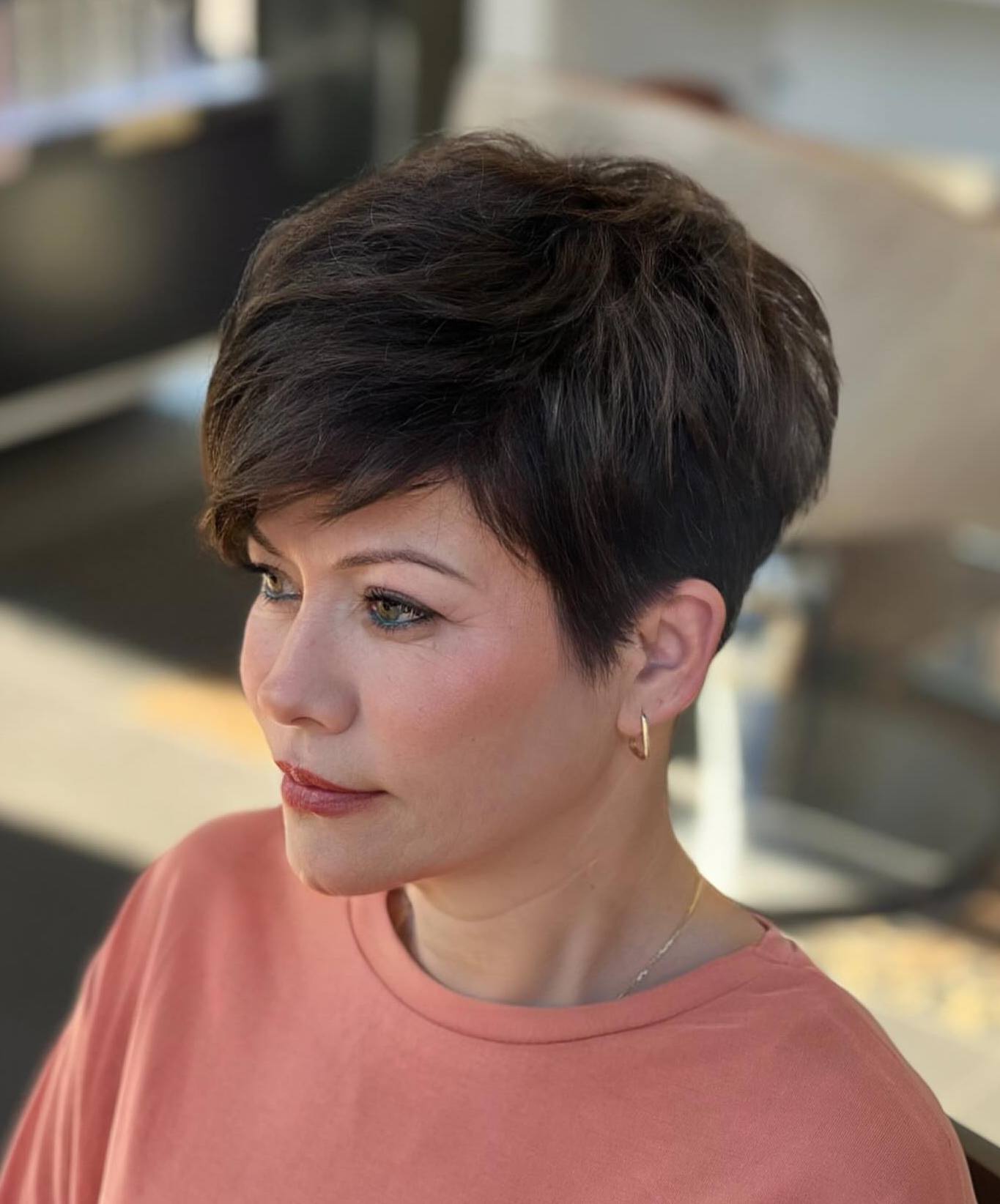This cut is great for women who want a little more ease with their hair. A classic pixie cut is very customizable and works with any hair texture and thickness. To create an illusion of thickness for a darker color and more texture, add blonde highlights.