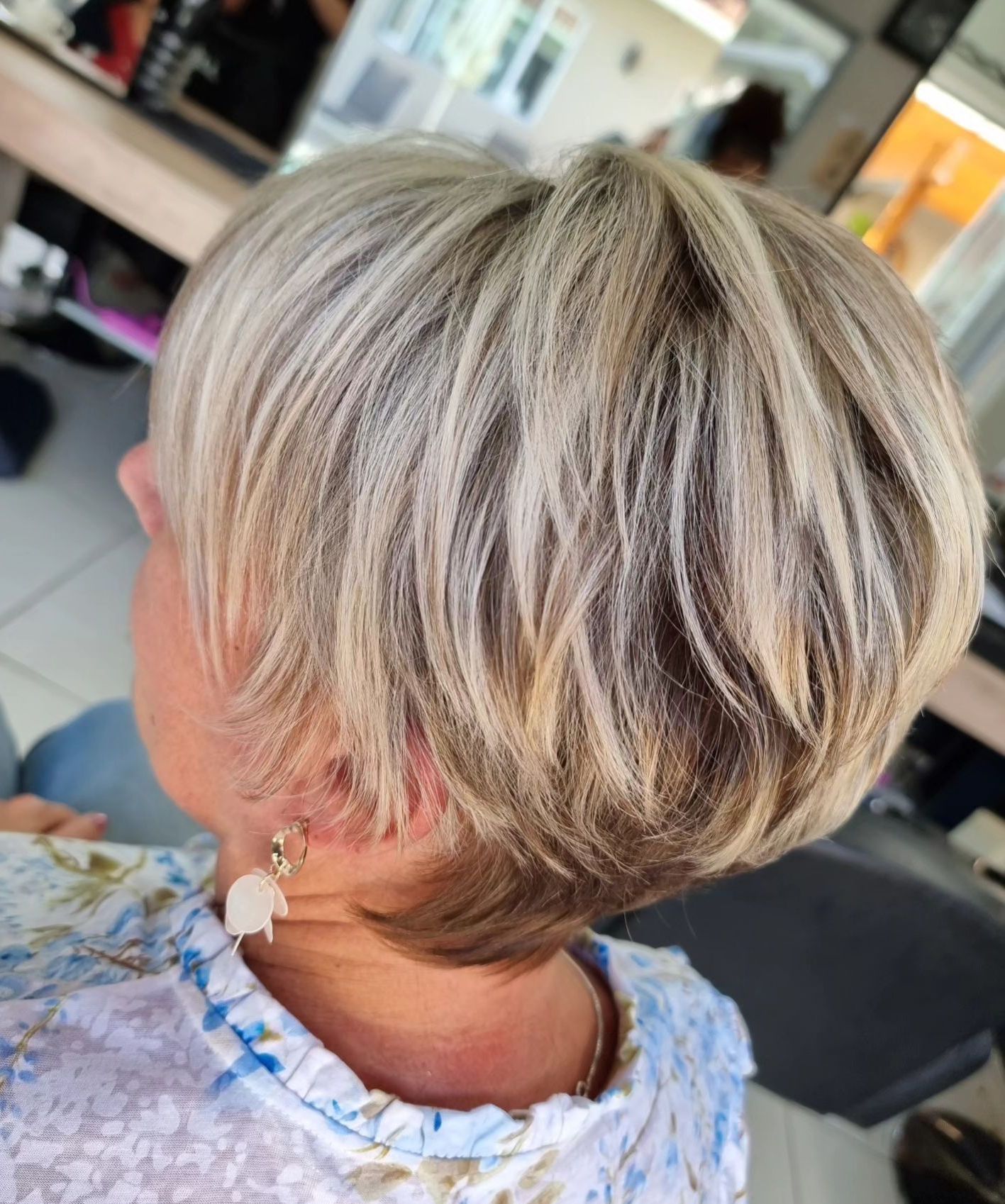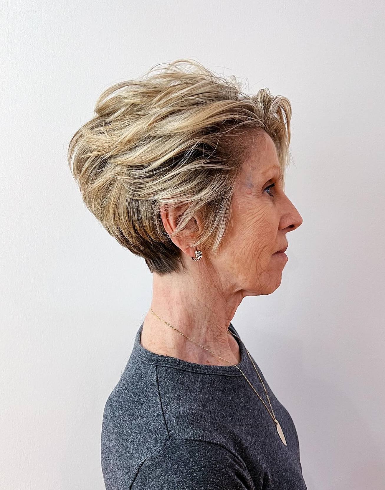 Pixies are the desired look for women as they age. Keeping the crown section feathered also adds the much-needed height and oomph.