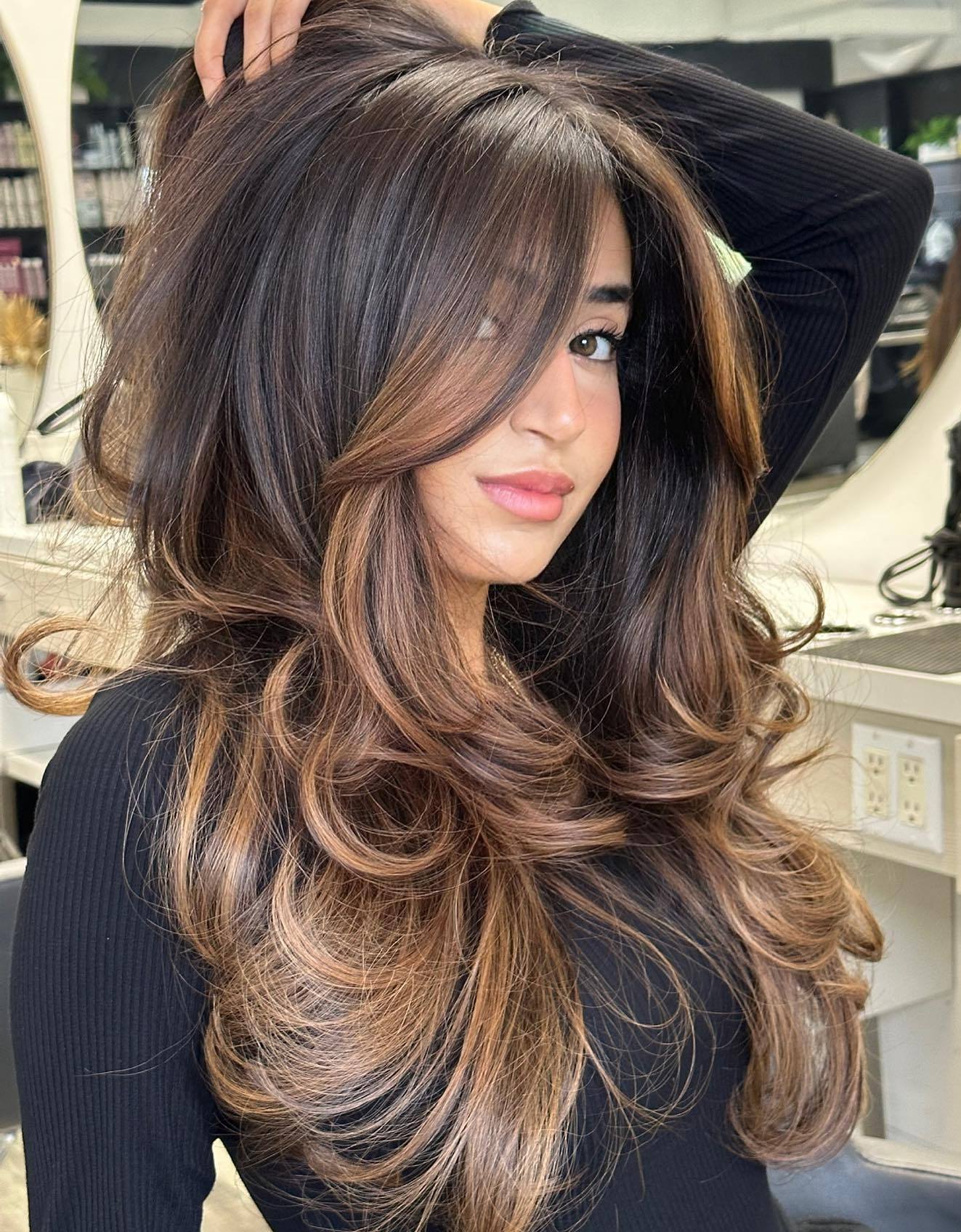 A seamless multilayered haircut like this never goes out of style. Make your brown hair layered and wavy throughout the length, and highlight it with blonde and caramel hues to create more movement and a fuller feel!