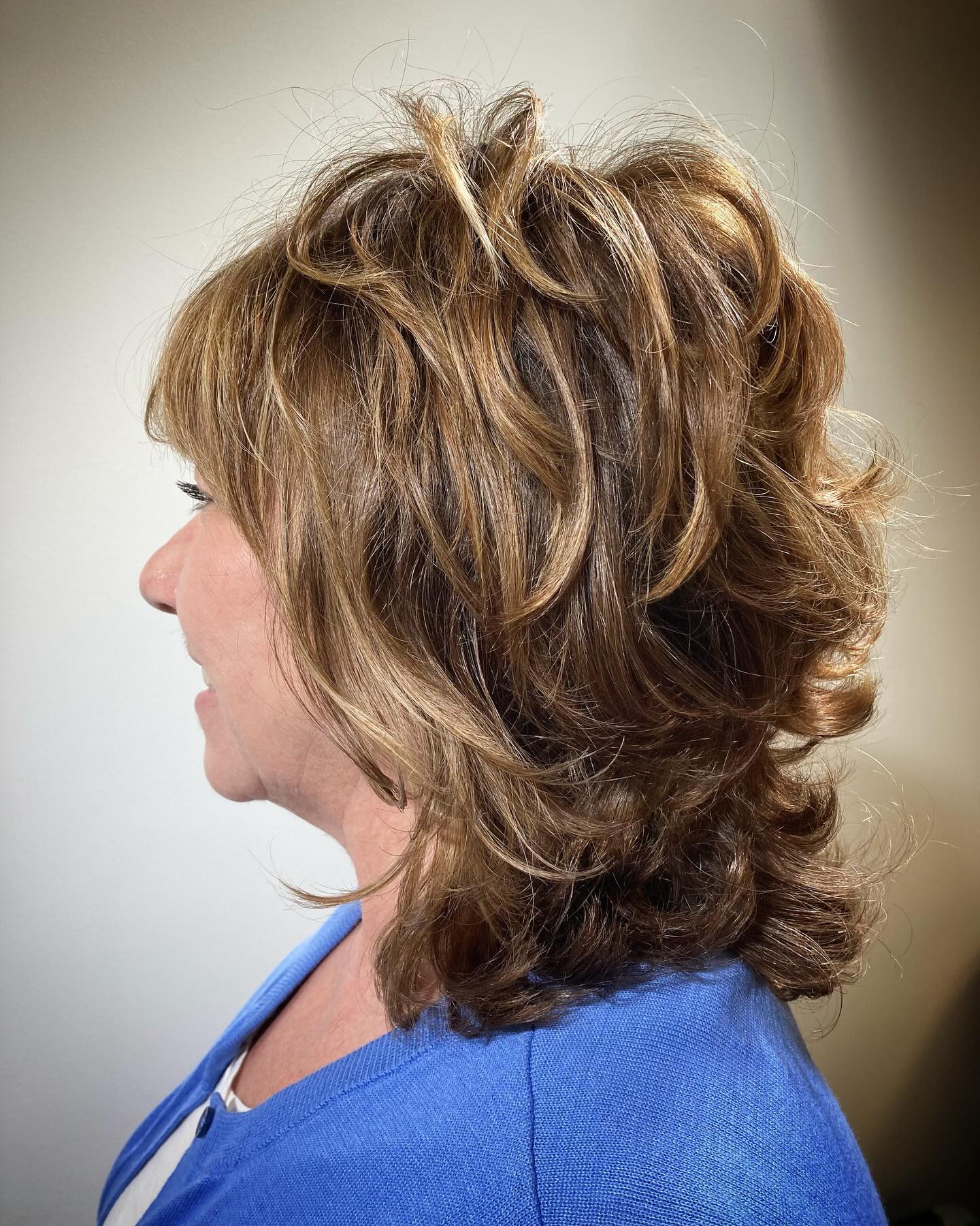 Women’s hair gets finer as they age, just like men’s. A teased hairdo with volume at the roots gives the appearance of a thicker mane. Those flicked-out layers and bangs also pump up strands and elevate the look.