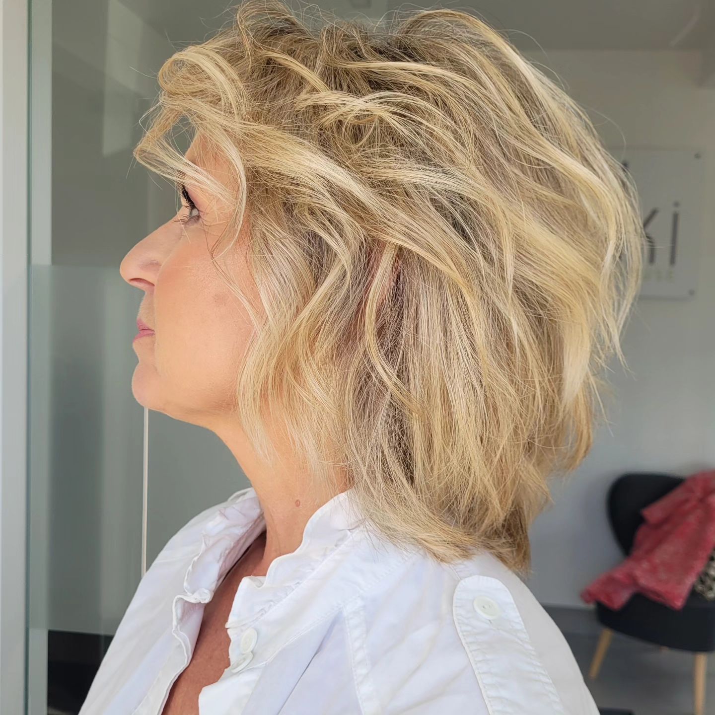 A vibrant shade of blonde knows no age. Style your layered bob with tousled, loose waves complemented by lovely golden blonde highlights. The color and styling look very natural and are great for everyday wear.