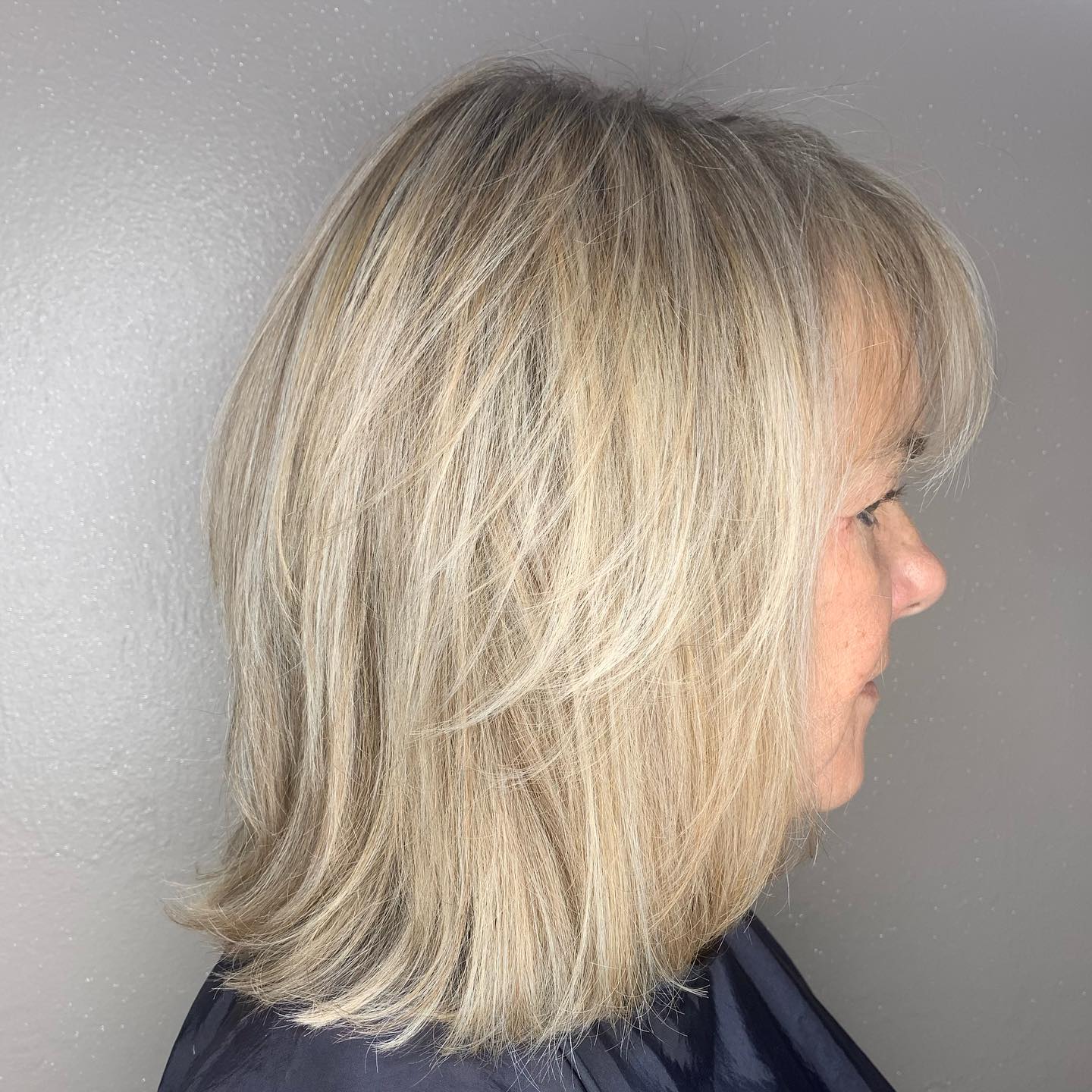 Check out this stunning lob that keeps you looking fabulous! Those feathered bangs work like magic, concealing forehead wrinkles, while the bronde balayage infuses the hairstyle with an irresistible glow.