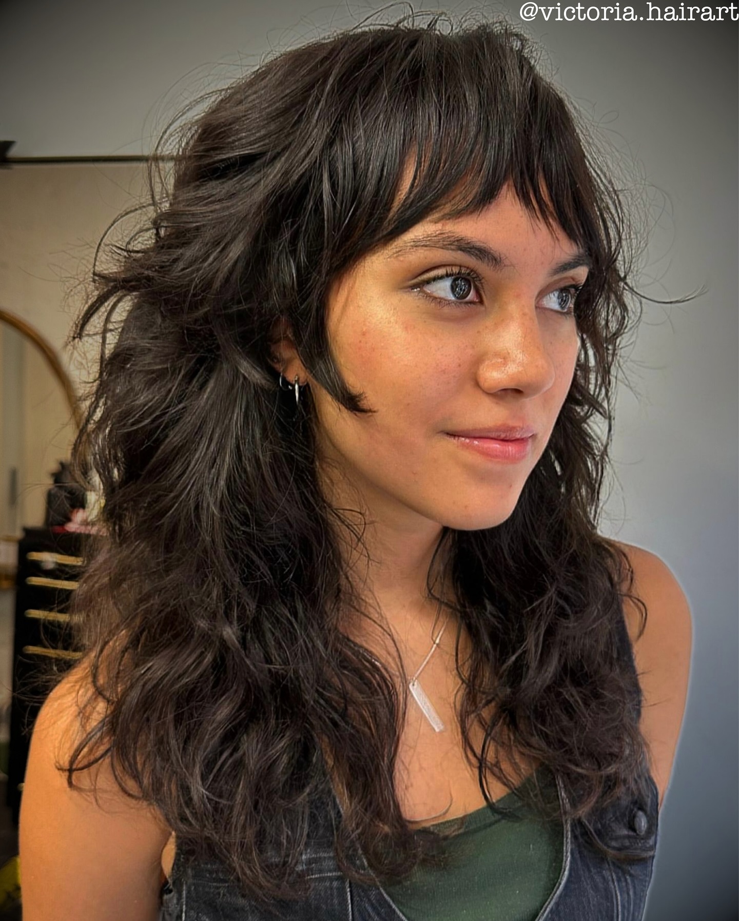 It’s impossible to imagine a classic shag without bangs, and why would you do that if a thick fringe creates such an effortlessly cool look? Pair it with soft, wavy layers to create the voluminous texture as stunning as this!