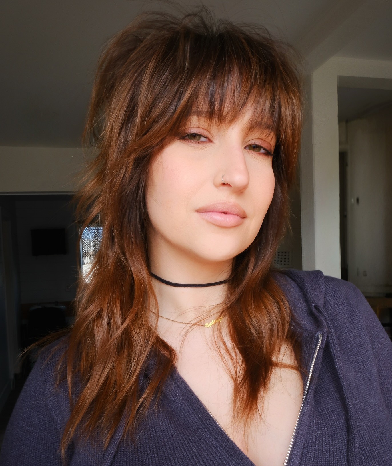 Featuring thick, choppy layers and heavy curtain bangs, this wolf haircut takes more from the shag cut and less from the mullet. Paired with the bright burned orange hair color, it looks totally on point.