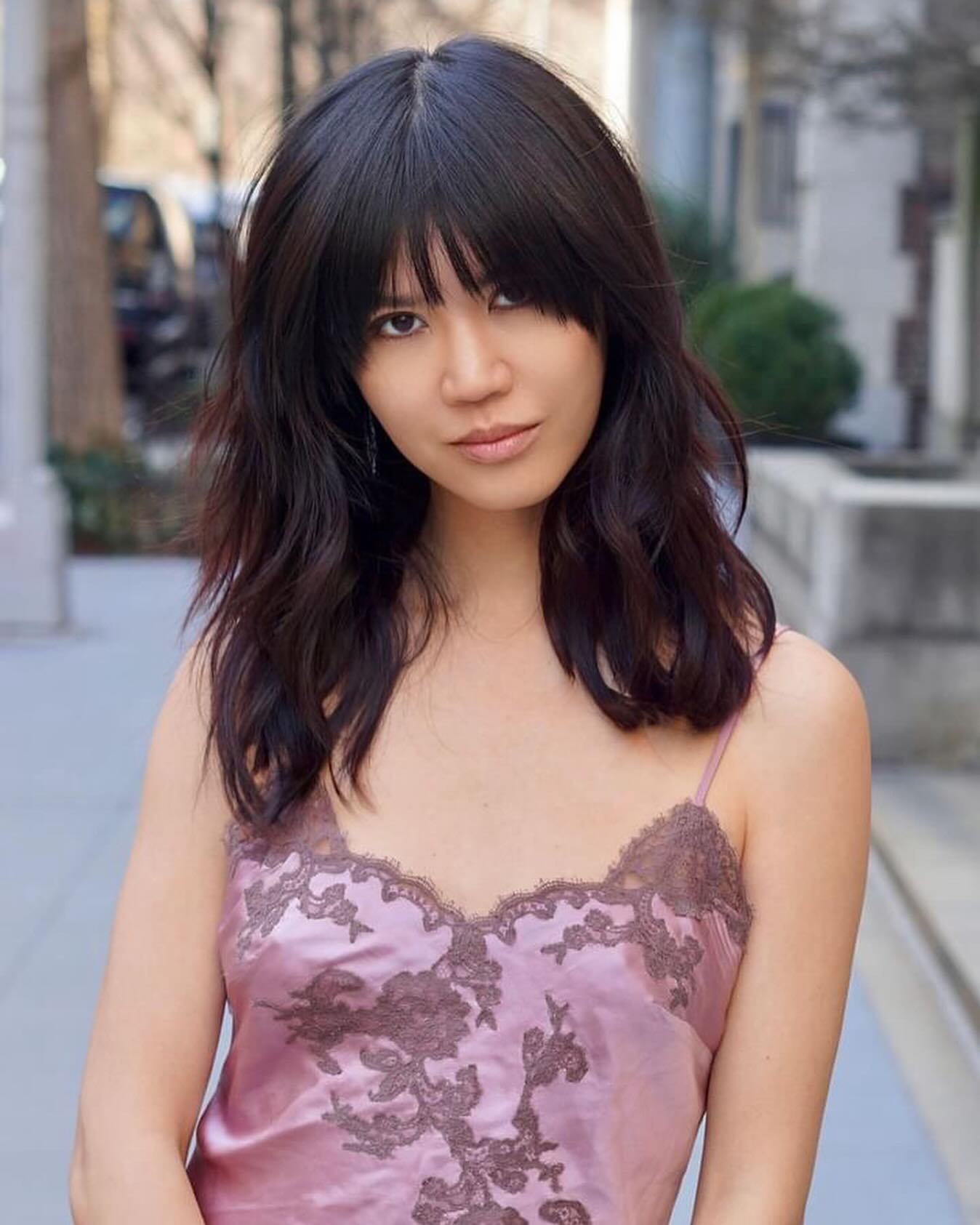 Grungey shoulder-length hairstyles are foolproof and flattering for many face shapes. Feathered with sparse front bangs, this one offers a mysterious and sultry aesthetic that is hard to ignore. Faint highlights alleviate the bob’s dimension factor, too.