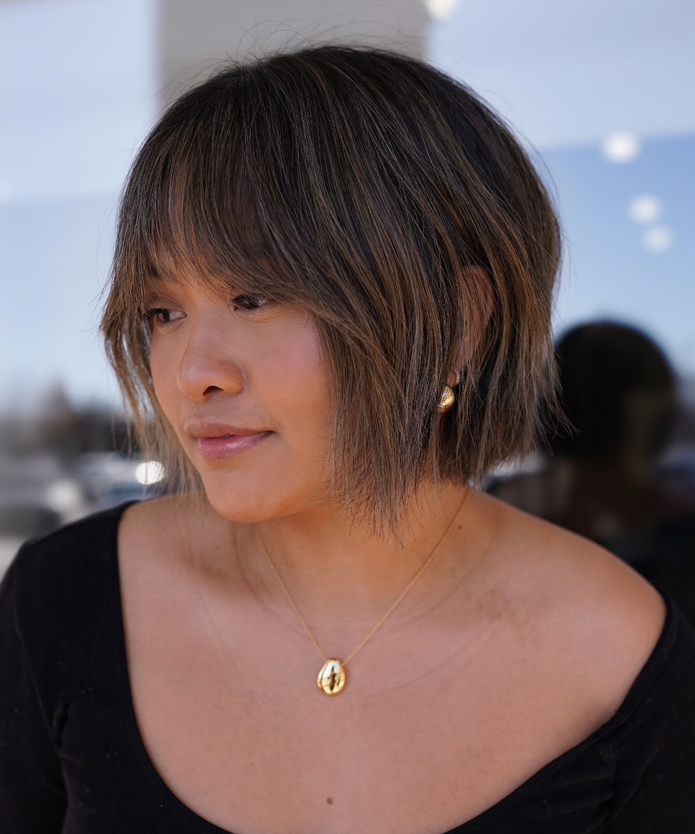 Short haircuts are among the most low-maintenance styles, but if you don’t want to go short, we have another awesome option! A flattering medium-length layered cut featuring long curtain bangs is a perfect alternative to a short bob.