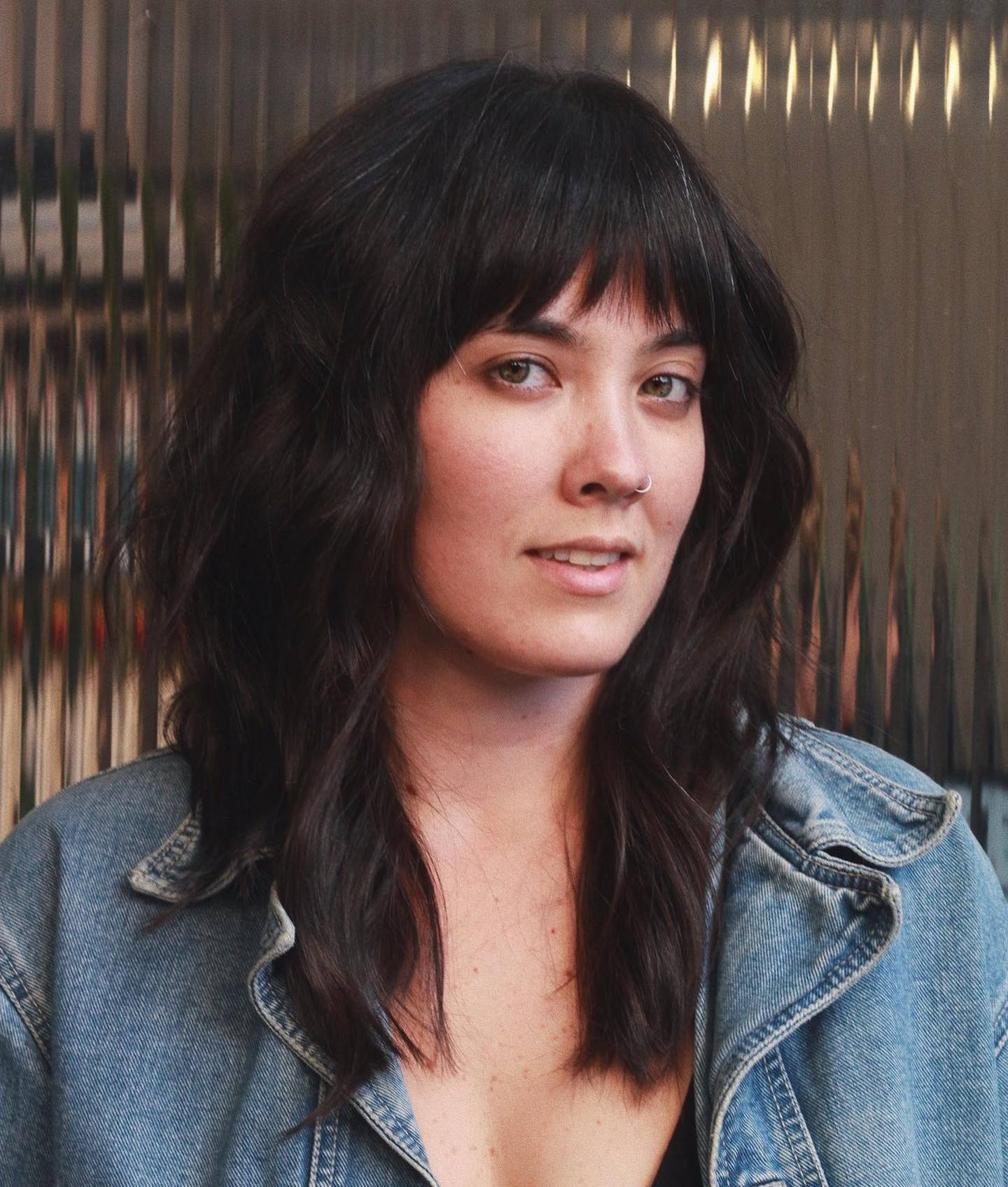 Condition your hair thoroughly before air-drying, then add a styling product to create a purposefully tousled finish. The bangs add structure to the loose, textured curls.
