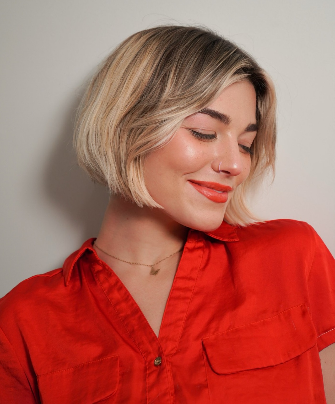 This voluminous bob features platinum blonde lengths with darker roots for easy maintenance. You can achieve the rounded ends with a few passes of a flat iron or by blow-drying with a round brush on towel-dried hair.