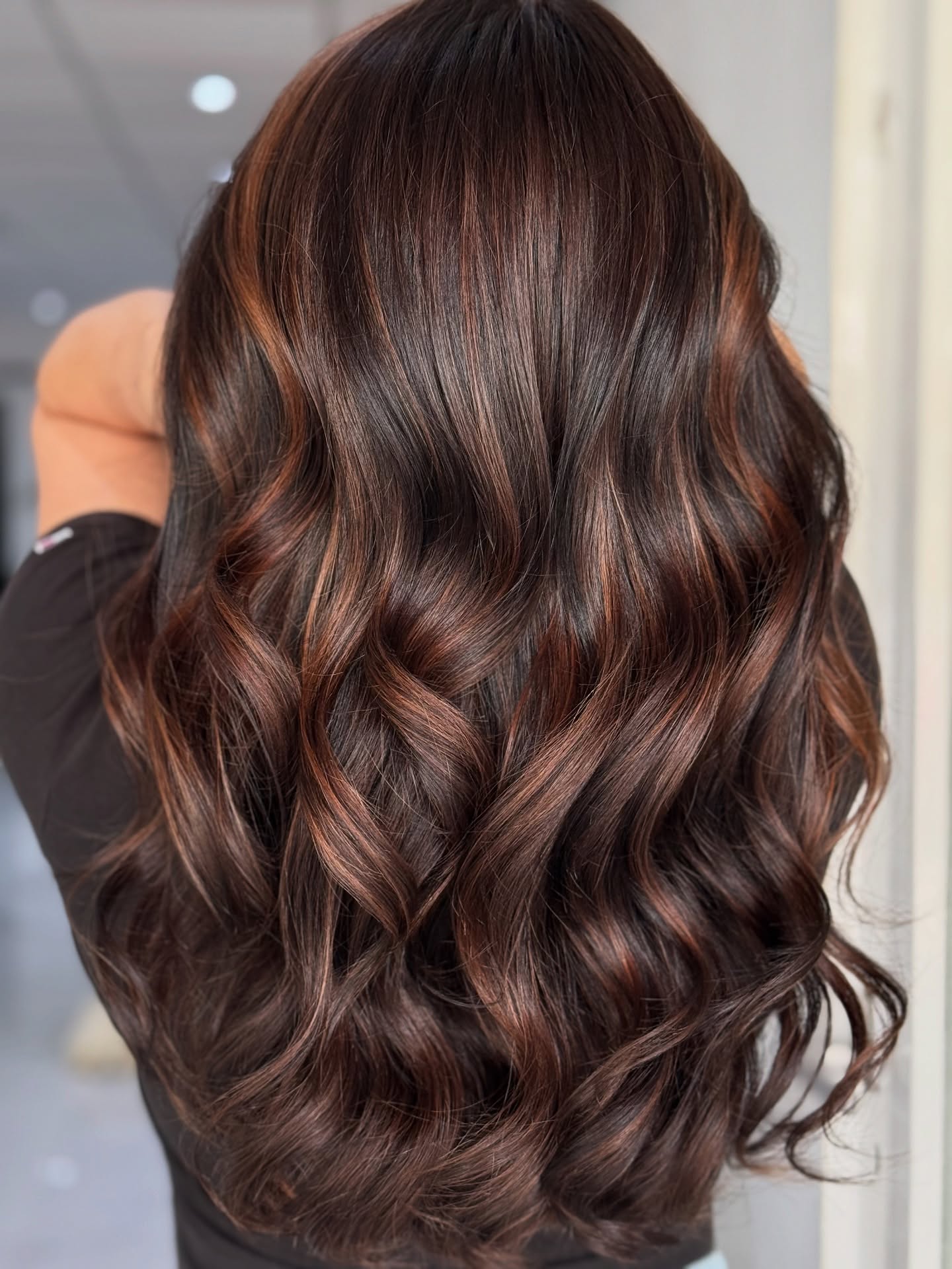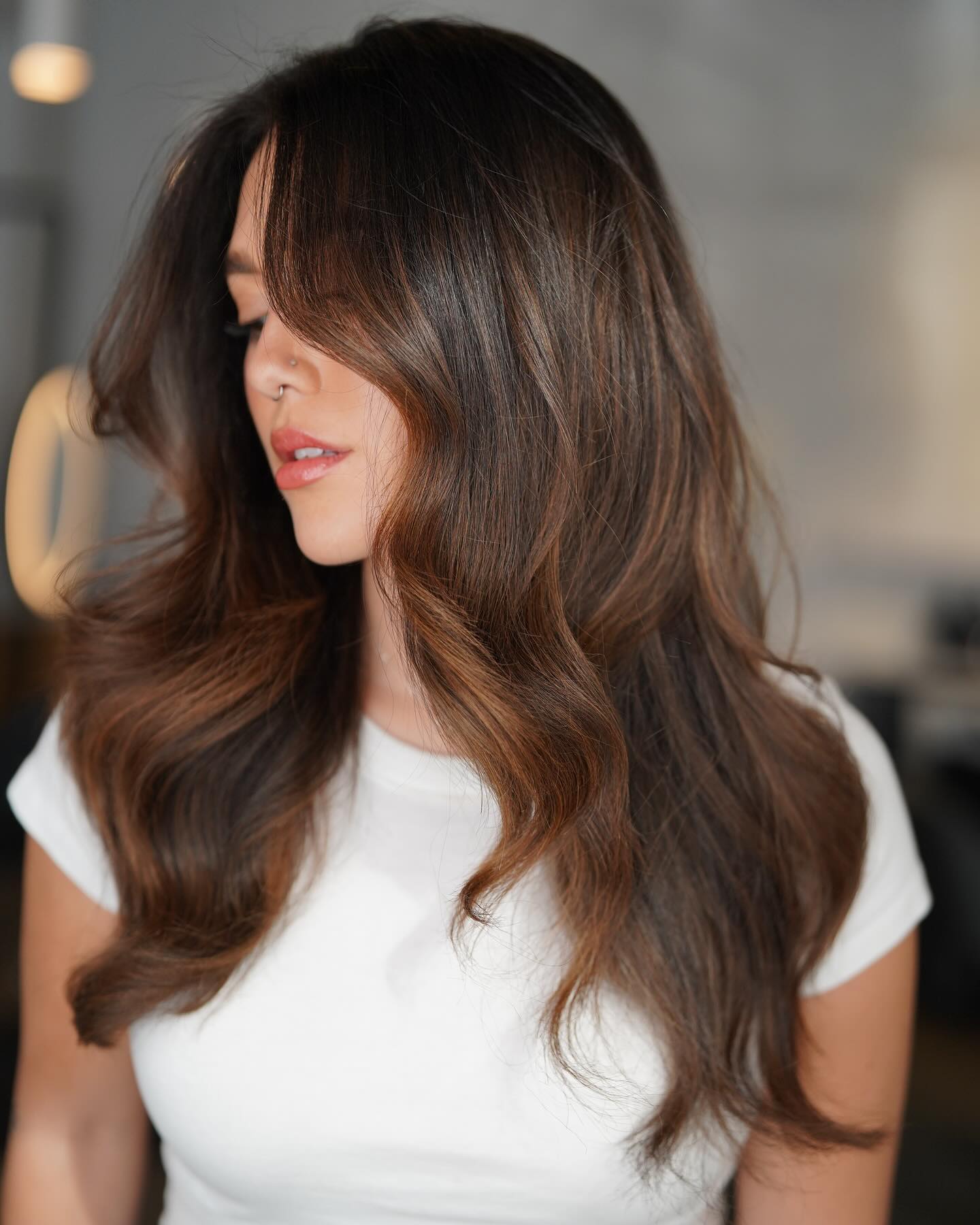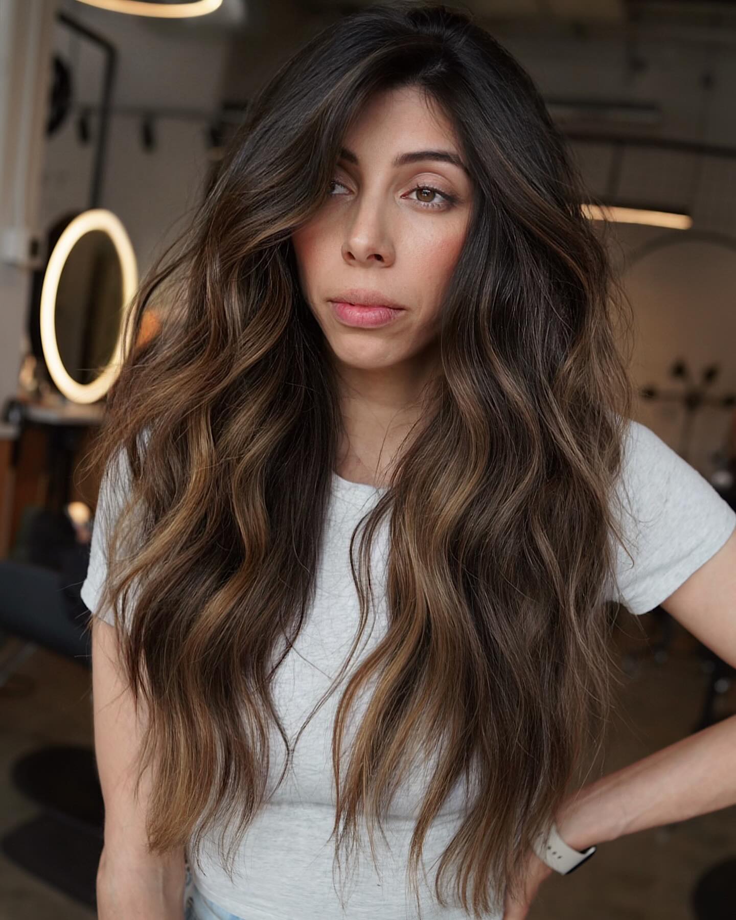 The color transition doesn’t have to be dramatic to make an impact. Dark brown hair with highlights, such as soft, milk chocolate tones on the ends and around the face, offers a subtle yet beautiful lift. If you have shoulder-length locks, style them in loose, messy waves for a modern and feminine finish.