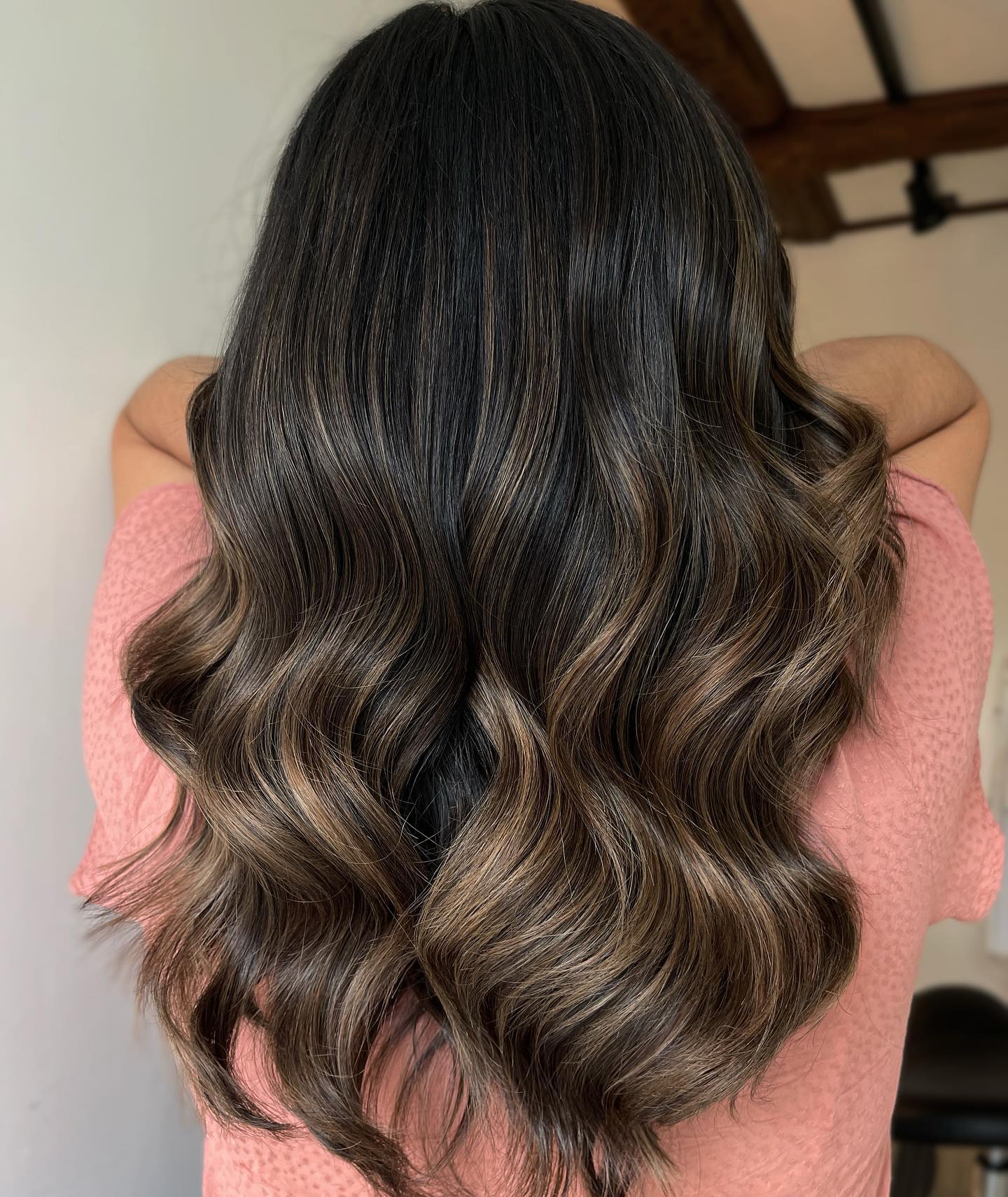 Warm highlights are an overwhelmingly popular option; however, if you choose cool shades, they will intensify the inner glow of your naturally dark hair. For better results, curl your locks and apply some texturizing spray.