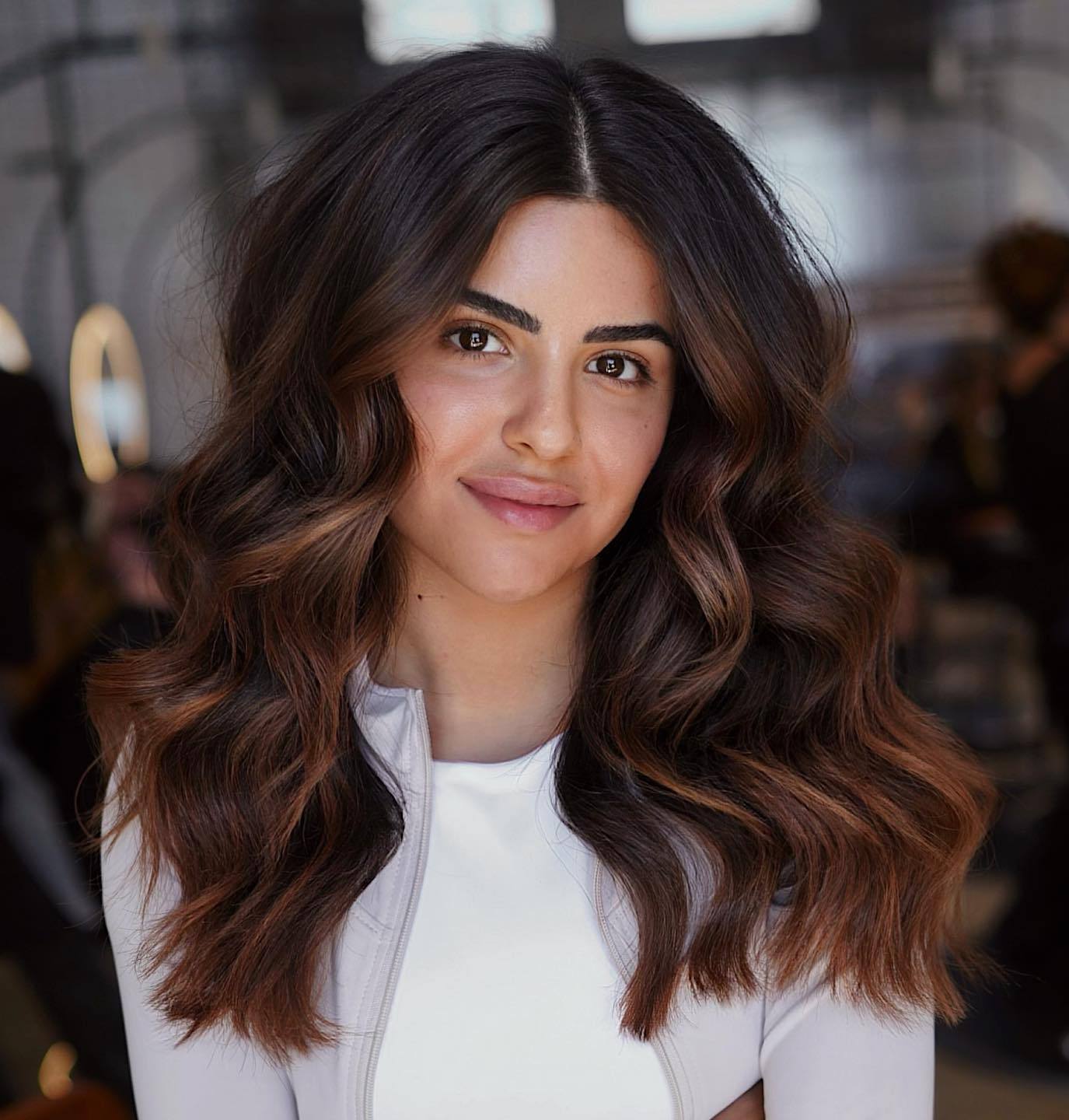 If you have naturally wavy hair, this well-blended balayage is a perfect choice to accentuate your texture. Go with a medium brown for the roots and a beautiful auburn, as the main color, gaining its intensity towards the ends.