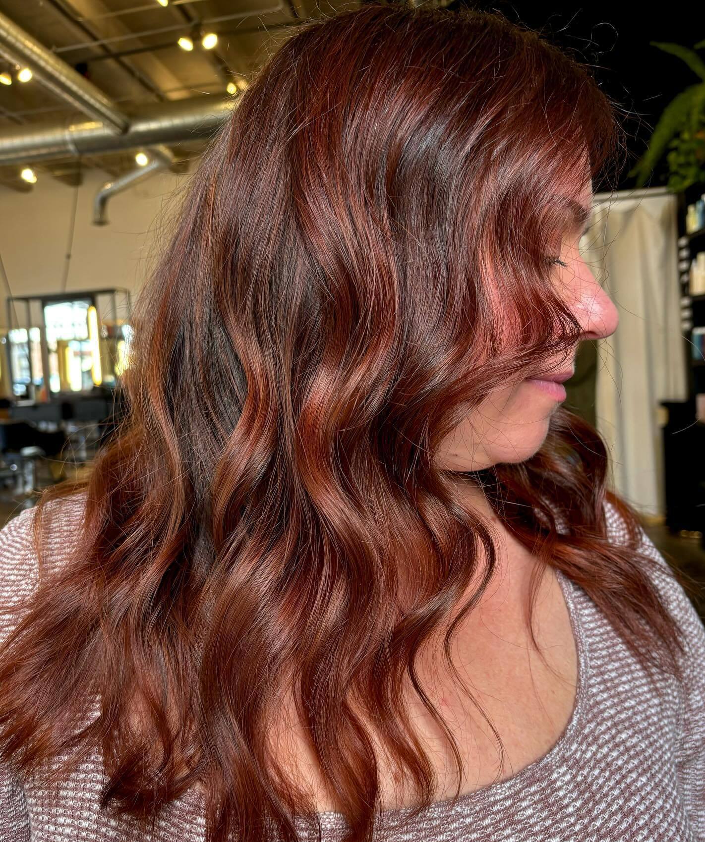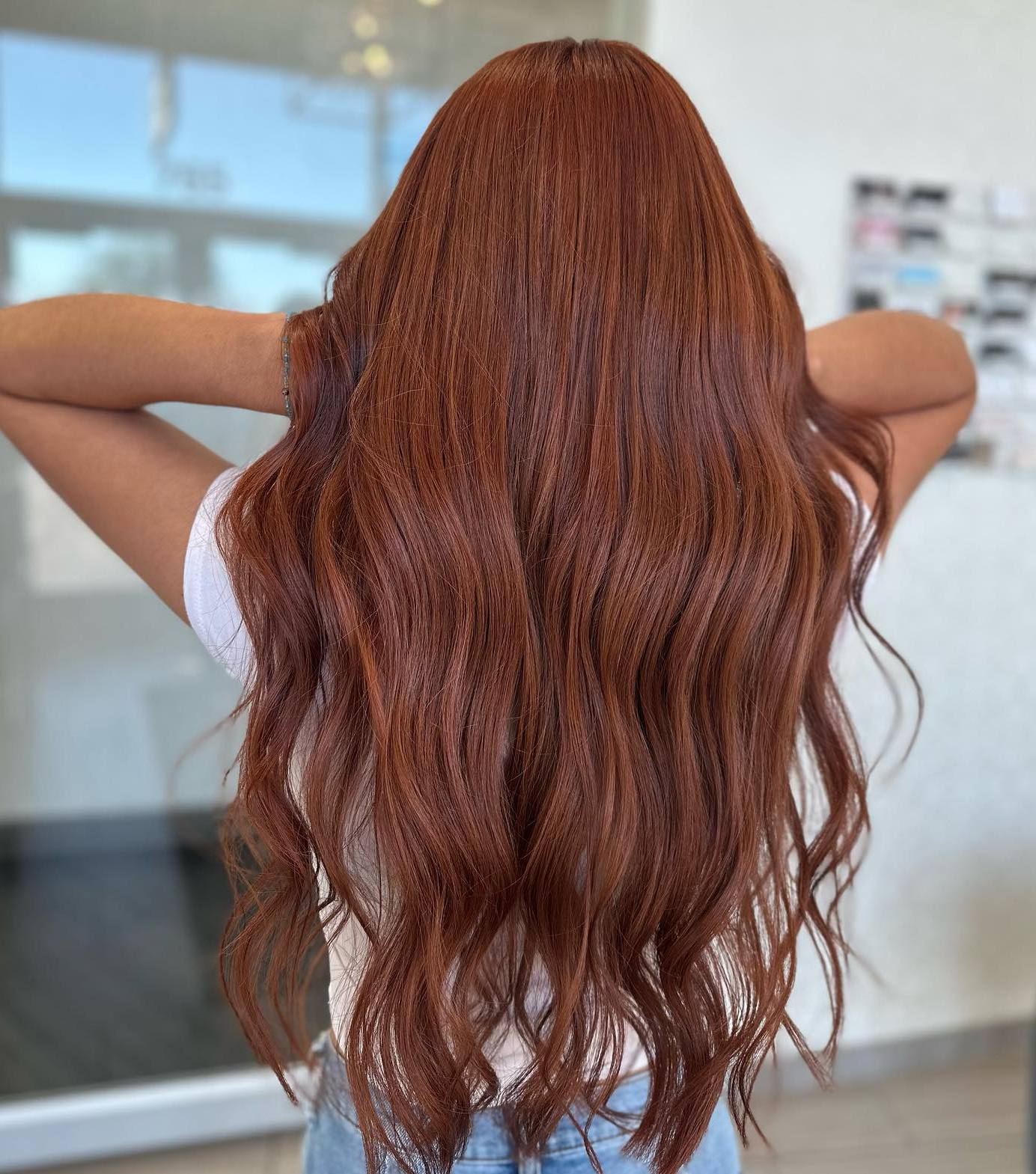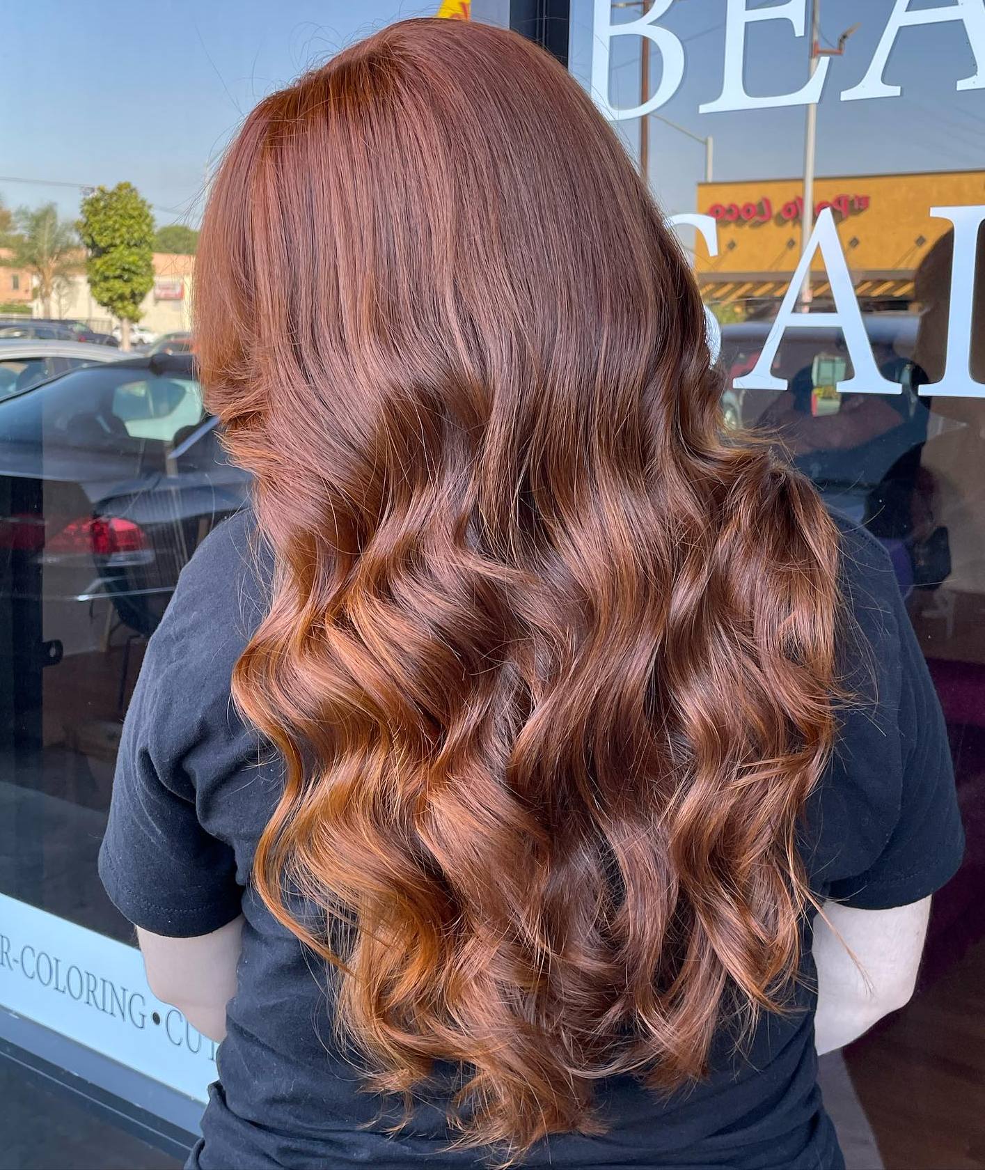 Fall in love with this mind-blowing copper red hairstyle that oozes classy, Old-Hollywood vibes. Style smooth waves that flow like silk to show off the depth and shine of your new hair color.