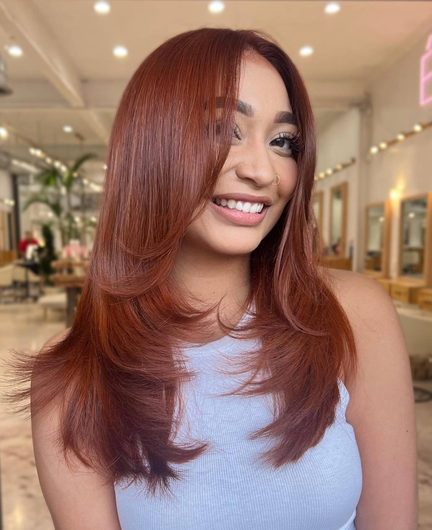 If you’re uncertain about what shade to use, play around with a color chart, considering different shades of brown hair, as well as reds and some tones in between. Consult a hair colorist who’ll work their magic to choose the perfect shade for your complexion and eye color. These cherry, chocolate, and copper hues look amazing for long locks.