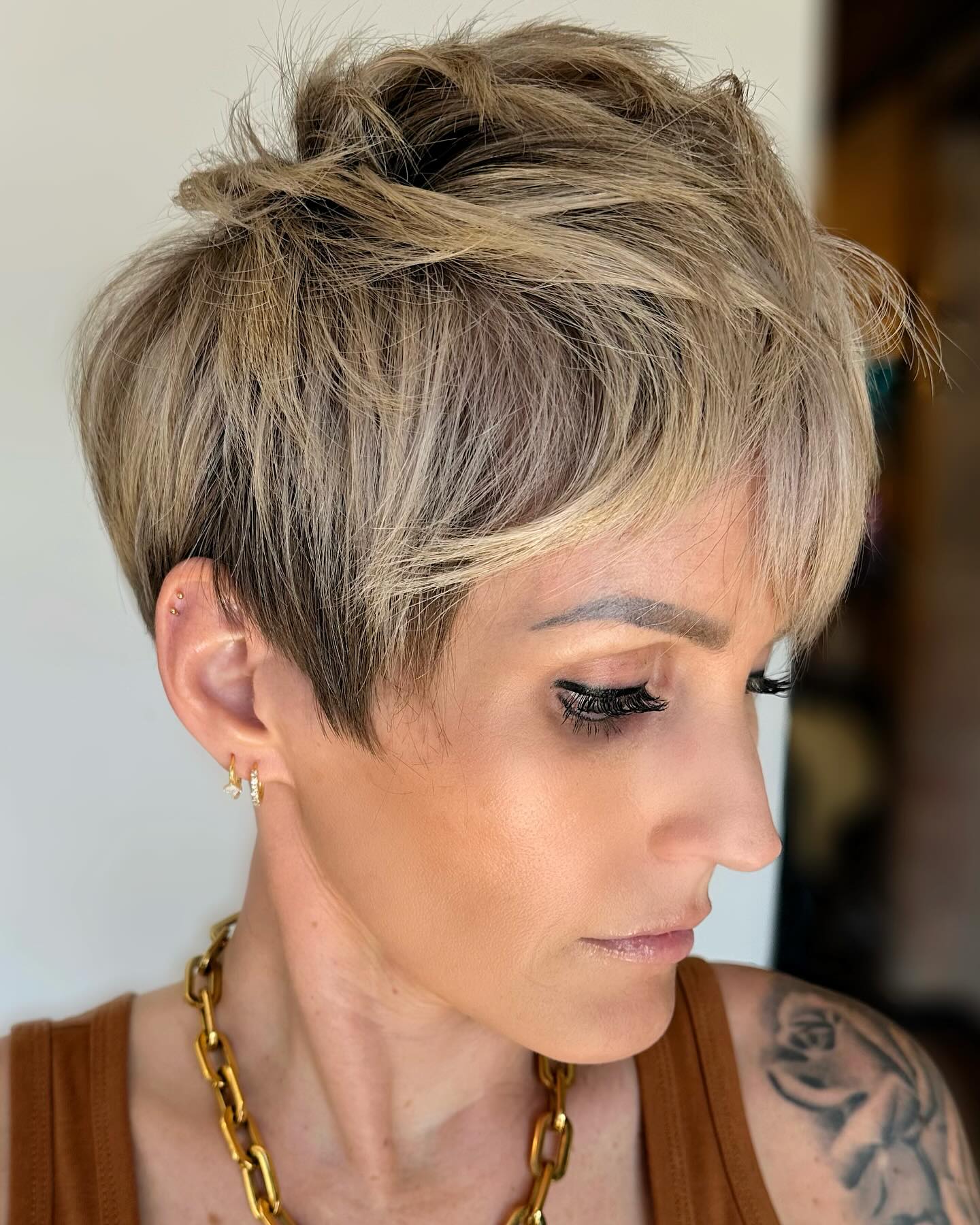 Think fluffy, not fussy. A textured pixie adds softness up top and does away with bulk at the sides. Often favored by older women, this cut keeps things fresh without going ultra-edgy. It’s proof that very short haircuts don’t have to feel harsh.