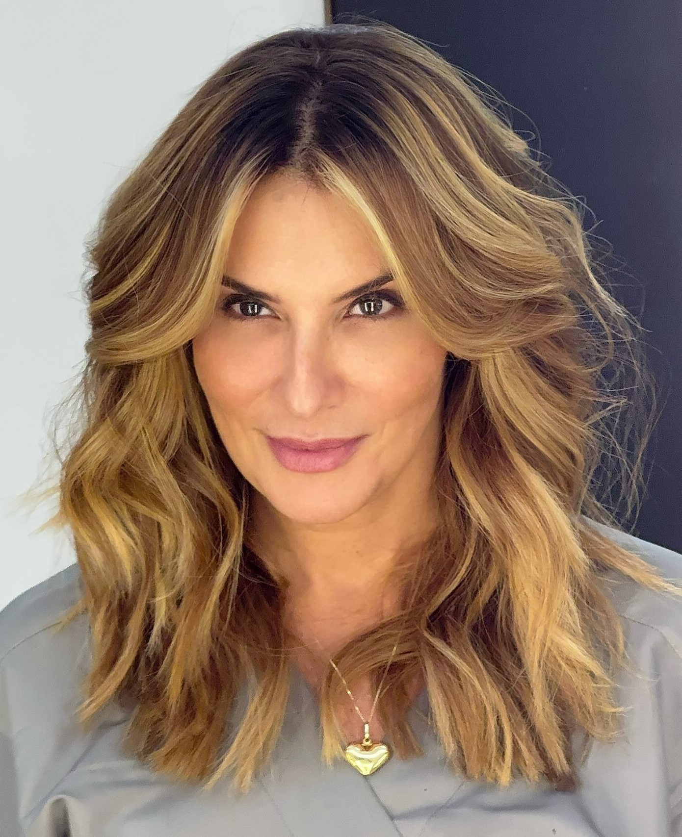 It’s hard to find anything more beautiful than healthy shiny brunette hair. An ultra-shiny finish boosts the effect, while the dark caramel highlights match the color of Gina Gershon’s eyes. To accentuate the layered edges of this chic medium-to-long haircut, its ends are curled out.