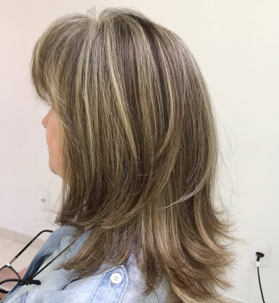 We love this lived-in shaggy style on older women thanks to its versatility and visual depth. With blended highlights and lowlights, embracing grays has never been more natural. Flowy framing bangs make the style very soft and touchy.