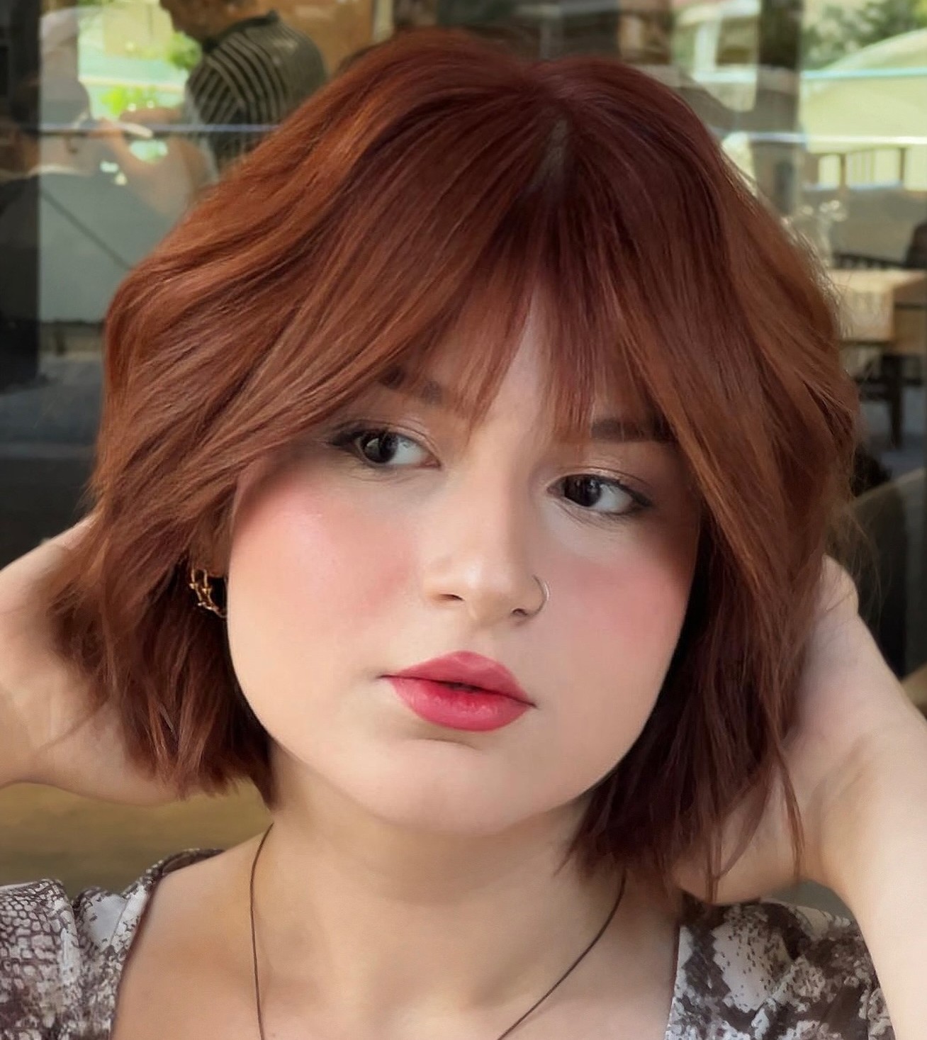 Do you want to do something more creative than simple straight or blunt bangs? The neck-length bob with baby bangs slims down the face, turning the cut into one of the best short hairstyles for a round face shape. Plus, thick short bangs lift the forehead and make the look open.