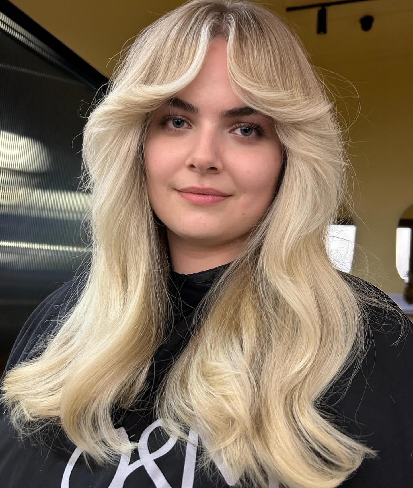 Round faces always benefit from long curtain bangs. If you want to try bangs and don’t know what type to choose, this is a safe solution. Combine them with a long textured haircut for a more chiseled visage.