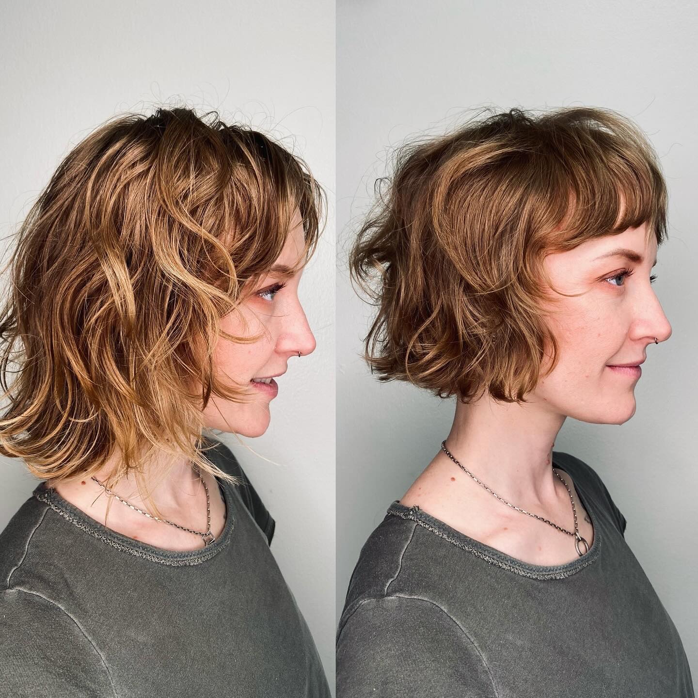 When you’re in the market for a new bob hairstyle, consider trying a modern twist on the classic wedge style. The side part and overall round shaping works perfectly with your natural waves, and grazes the jawline, beautifully framing the face. The muted hues of the ash-blonde balayage are timeless.