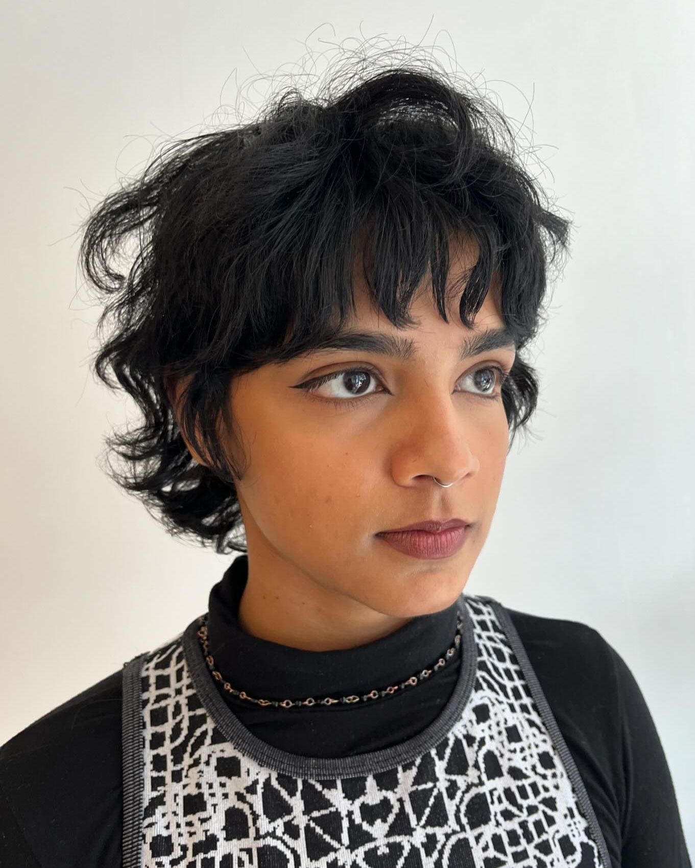 When you need an easy-to-style haircut for thick hair, look no further than a short, choppy bob. This one tapers gently to the nape and has slightly longer front pieces that frame the jawline. Side-swept bangs add a touch of asymmetry that really makes the style work.