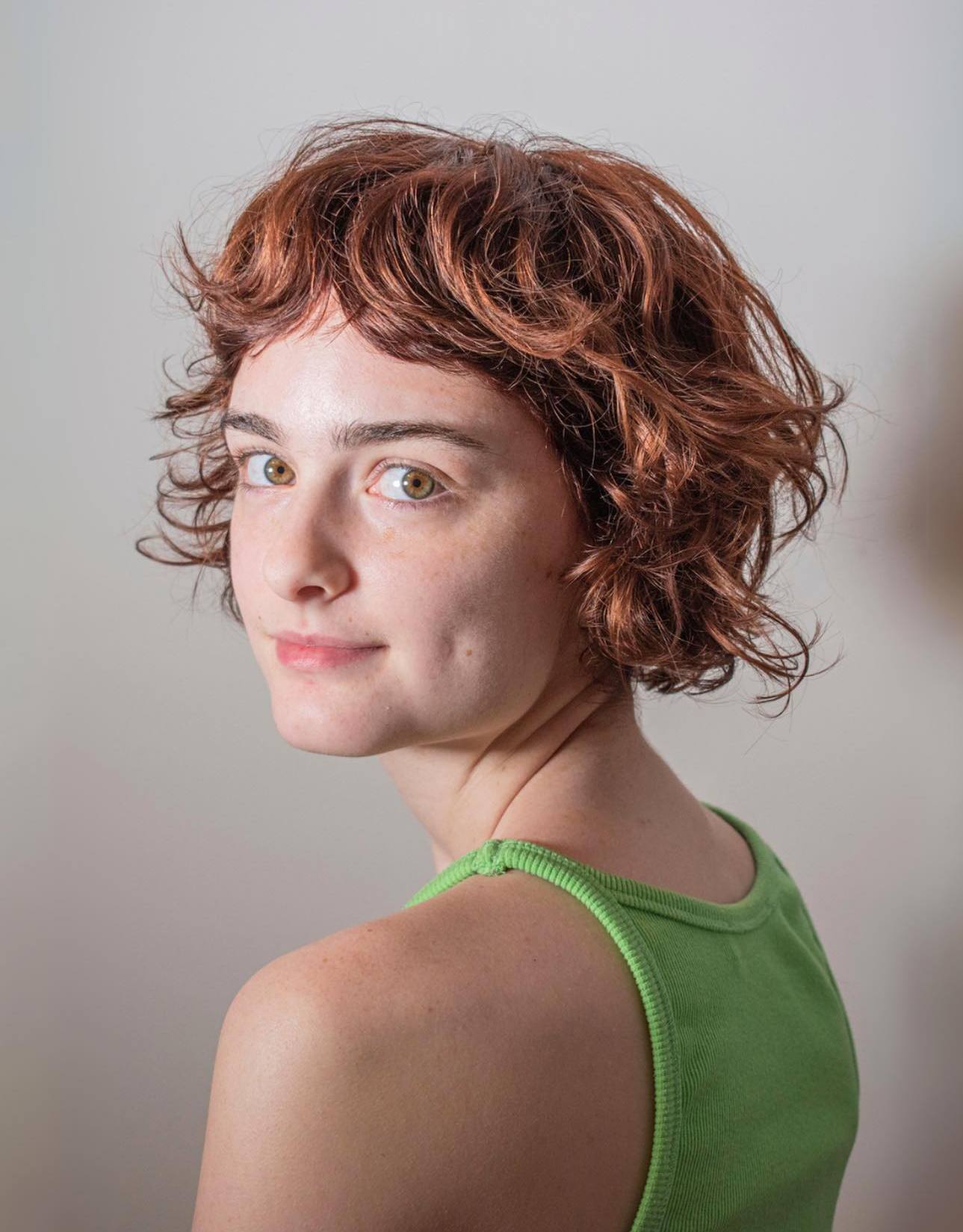 The slightly longer length of this pixie allows the curls to come to full fruition. At every angle there’s something exciting to look at: vibrant copper-blonde highlights, super-long sideburns, and flipped bangs that fall just over the eye.
